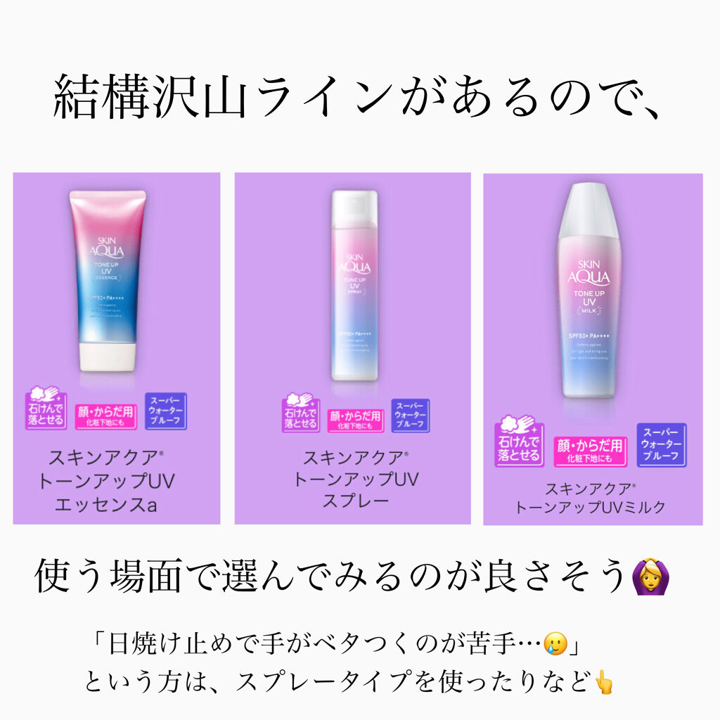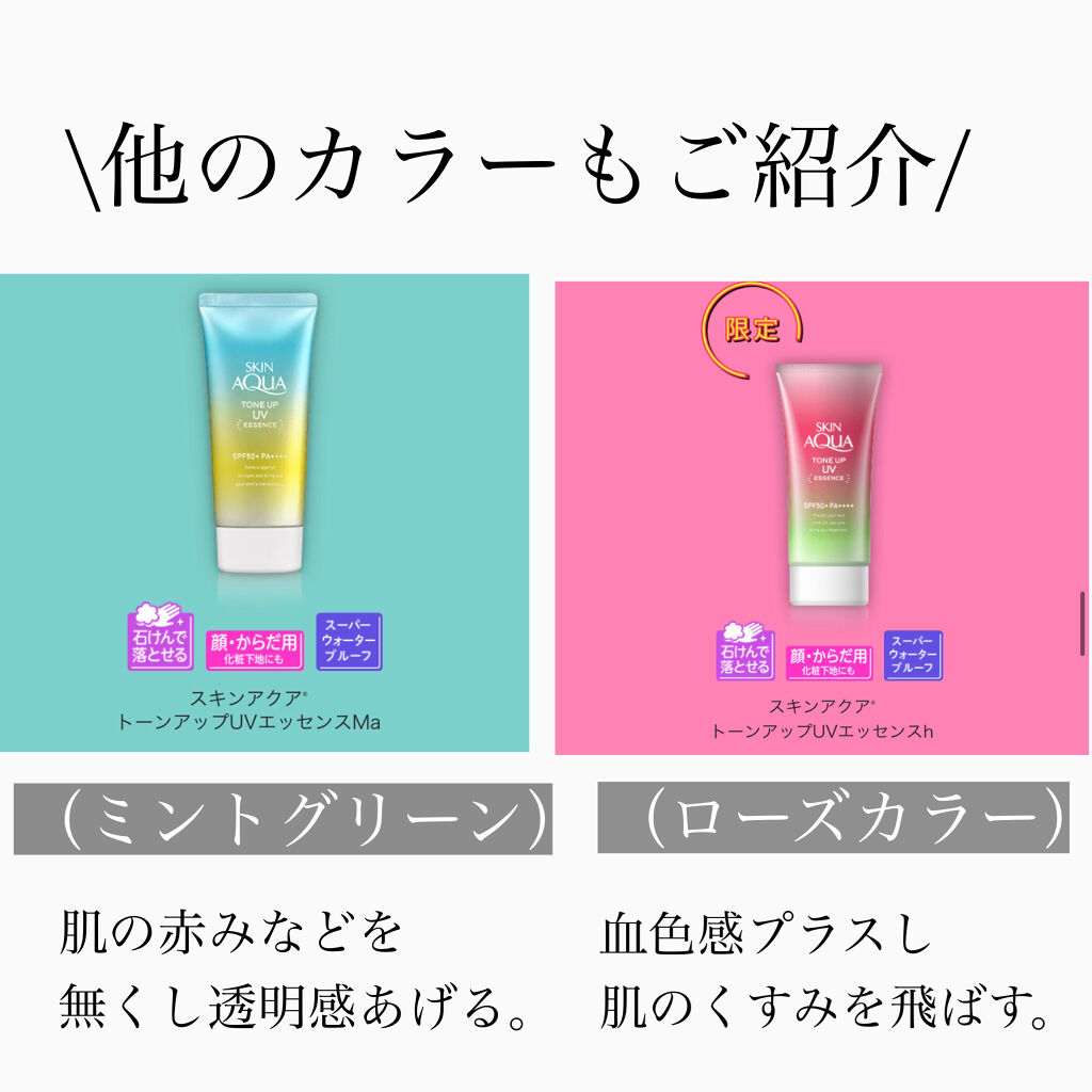 - ※カラー名称「ハピネスオーラ」は「ローズ」へ名称変更となりました。 <ミントグリーン> 赤み補正*1!UVカットしながら、色と光をコントロールし、肌をトーンアップ*1。 ミントグリーンカラーで透き通るような素肌つづく!エッセンスタイプの日焼け止め。 透明感*1のある肌に。 SPF50+、PA++++、UV耐水性★★。 鉱物油フリー。パラベンフリー。ときめくサボンの香り。 <ラベンダー> 明るさ補正*1!UVカットしながら、色と光をコントロールし、肌をトーンアップ*1。 透明感*1を引き出すラベンダーカラーの日焼け止め。 すーっとのびて、みずみずしい使い心地のエッセンスタイプ。 SPF50+、PA++++、UV耐水性★★。 鉱物油フリー。パラベンフリー。ときめくサボンの香り。 <ローズ> 血色感補正*1!UVカットしながら、色と光をコントロールし、肌をトーンアップ*1。 ローズカラーで血色をプラスし、透明感*1のある肌に。 エッセンスタイプの日焼け止め。 SPF50+、PA++++、UV耐水性★★。 パラベンフリー。ハピネスブロッサムの香り。 <ブルー> UVカットしながら、色と光をコントロールし、肌をトーンアップ*1。 血色感を抑えて儚げな色白肌*1に見せるブルーカラーの顔・からだ用日やけ止め。すーっとのびて、みずみずしい使い心地。 透明感ブルー×透明感ホワイト=はかなげブルーカラーで、自分史上最高*2の色白肌*1、うるおう美容液成分(うるおい成分)としてヒアルロン酸Na、ビタミンC誘導体*3配合。 SPF50+/PA++++。こころがときめくサボンの香り。化粧下地にも。石けんで落とせます。 パラベンフリー。鉱物油フリー。アレルギーテスト済み(全ての方にアレルギーが起こらないというわけではありません)。 *1:メイクアップ効果による *2:スキンアクアシリーズにおいて *3:リン酸アスコルビルMg(うるおい成分)
