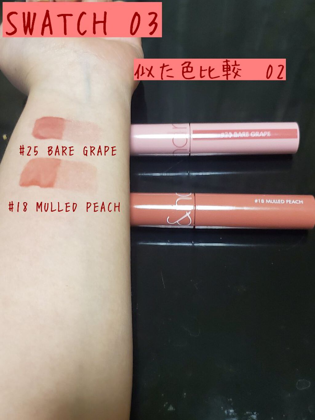 25番のBARE GRAPEは23番よりも青みが強く、ブルベ向き (特にブルベ夏)でした。 色持ちは塗り直し前提なら十分です。ティッシュオフしてもうっすら色が残り、強く擦っても取れません! カバンに一本入れておくと安心です。