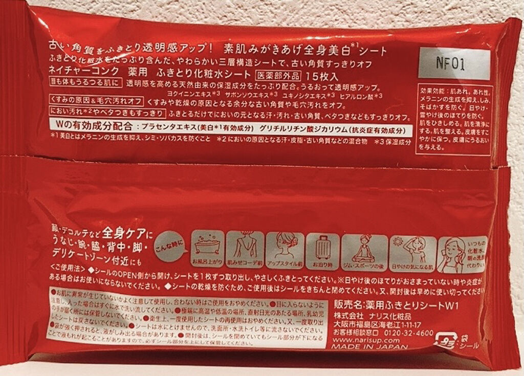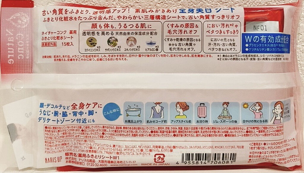 - \いつでもどこでも、顔も体もまるごと美白*&角質ケアできる「ネイチャーコンク」の全身肌みがきシート新登場!!/ ◆素肌を磨き上げる薬用全身美白シート。古い角質をふきとることで、透明感がアップ。 ●ふきとり化粧水をたっぷり含んだ柔らかい3層構造のシートが、古い角質をすっきり取り除き、顔も身体もうるつる肌に導きます。 ●くすみや乾燥の原因となる余分な古い角質や毛穴汚れだけでなく、においの元おとなる汗・汚れ・べたつきなども取り除きます。 ●顔、デコルテなどの全身ケアに。うなじ、腕、脇、背中、脚、デリケートゾーン付近にも。 ●アルコールフリー、無香料、無鉱物油、無タール系色素、弱酸性 <1枚で6役> 美白*、角質除去、朝の洗顔代わり、保湿、肌荒れ防止、浸透アップ <こんな時にオススメ> お風呂後の全身ケア、ジム・ヨガの後、日やけ後の肌に、旅行時のスキンケア、スキンケア時、朝の洗顔代わり、いつもの化粧水代わりにも *美白とは、メラニンの生成を抑え、シミ・ソバカスを防ぐこと