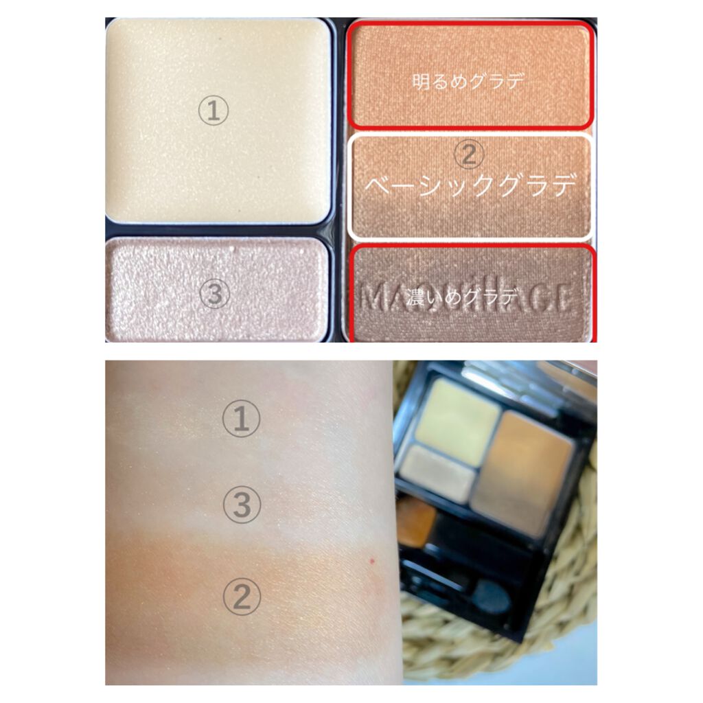 - (1)目もとクリアベース イソステアリルアルコール,ジメチコン,トリ(カプリル酸/カプリン酸)グリセリル,イソステアリン酸水添ヒマシ油,(ビニルジメチコン/メチコンシルセスキオキサン)クロスポリマー,マイクロクリスタリンワックス,水添ヒマシ油,セルロース,ポリエチレン,水添ポリイソブテン,ヒアルロン酸Na,パラフィン,合成ワックス,トコフェロール,リンゴ酸ジイソステアリル,アルミナ,トリ酢酸テトラステアリン酸スクロース,シリカ,ポリリシノレイン酸ポリグリセリル-6,BHT,プロピルパラベン,メチルパラベン,マイカ,合成金雲母,酸化チタン,酸化鉄 (2)シームレスグラデカラー タルク,ラウロイルリシン,ジメチコン,リンゴ酸ジイソステアリル,イソステアリン酸水添ヒマシ油,トリエチルヘキサン酸トリメチロールプロパン,ワセリン,セスキイソステアリン酸ソルビタン,ヒアルロン酸Na,ジステアリン酸Al,トコフェロール,シリカ,酸化スズ,アルミナ,エチルパラベン,メチルパラベン,クロルフェネシン,マイカ,酸化鉄,酸化チタン,合成金雲母,グンジョウ,赤226,黄4 (3)艶ポイントカラー タルク,リンゴ酸ジイソステアリル,ワセリン,ジメチコン,トリエチルヘキサン酸トリメチロールプロパン,メタクリル酸メチルクロスポリマー,イソステアリン酸水添ヒマシ油,ヒアルロン酸Na,セスキイソステアリン酸ソルビタン,ジステアリン酸Al,トコフェロール,酸化スズ,アルミナ,シリカ,メチルパラベン,エチルパラベン,クロルフェネシン,合成金雲母,マイカ,酸化チタン,酸化鉄,グンジョウ,赤226,黄4