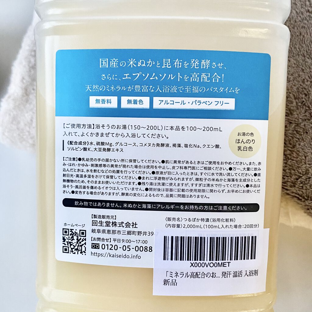 独自技術の発酵製法により作られた「つるぽかエプソムソルト」 天然のミネラル成分を高配合 エプソムソルトは塩と同じく安全な中性で水溶性の結晶です。 お風呂に入れることで、ミネラル成分を体内に吸収することができます。 天然のミネラルが豊富な入浴液で至福のバスタイムをお楽しみください こちらは液体タイプのエプソムソルトになります。 液体タイプなのでお風呂に入れてかき混ぜるとすぐに馴染んでくれて風呂底に塊があって踏んだら痛いなどの心配もありません。 栄養豊富な国産の米ぬかと海藻を発酵させ、さらにエプソムソルトを高配合した商品なのでお風呂上がりはお肌がしっとりとするのもオススメポイントです。 1回100mlずつ使えば約20回も使うことができるのでコスパがよいのも嬉しいですよね。