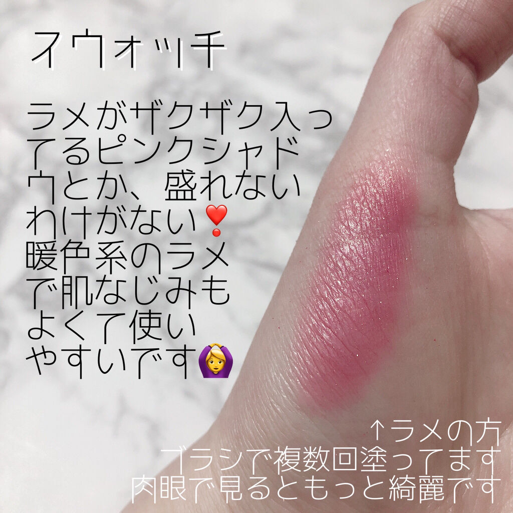 私は衝動買いしてしまったけど、ぜひ今後買う方はこのレビューを見てから購入を検討して欲しいです…!!! ブラシ付き 薄いピンクですごく可愛い…ᐡ⸝⸝> ̫ <⸝⸝ᐡ 4種類の質感 9色入っており、4種類の質感に分けることができます。 色持ちがいい 7色は、アイシャドウベースを使えば思ったよりも色持ちがよく、使いやすかったです! 色味についての注意 似たり寄ったりの色味が多いと感じた。 イエベ向きかも…? ゴールドラメが入っている色味が多く、イエベさん向きのパレットなのかもしれないなと思いました。 お気に入りカラーについて マシュマロ、チョコクランチ