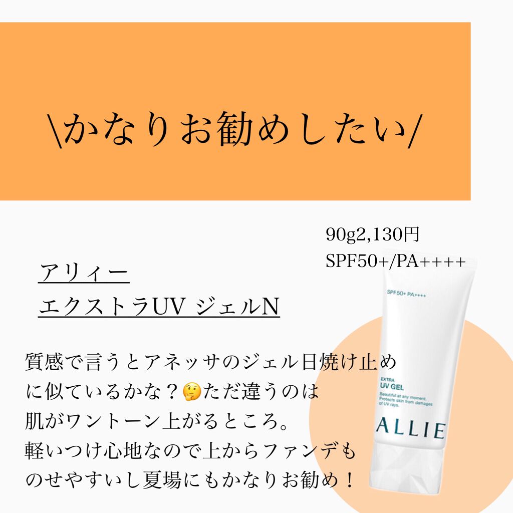| 日焼け止め・UVケアランキング第9位 | 全身ツヤ肌仕上げしてくれるジェルUVであり、 みずみずしいジェルが素肌にすーっとのびて均一に密着! | 詳細を見る | |