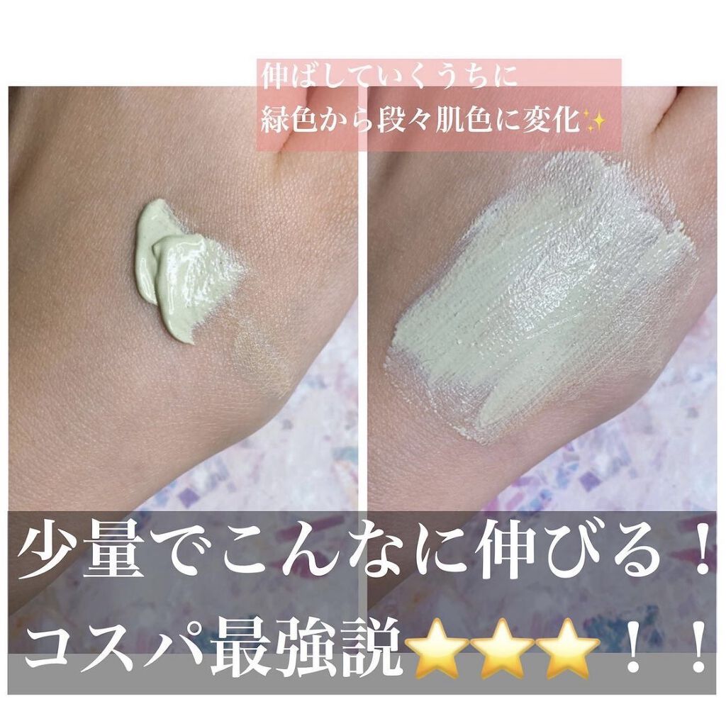 - 赤みをきちんとカバーするスキンケア兼用下地。緑色のクリームが肌でベージュ色に変化し、ニキビ跡やくすみをカバーします。