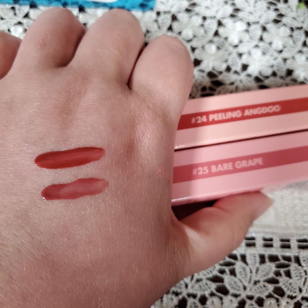 - <06 フィグフィグ(FIGFIG)> 水、オクチルドデカノール、ジメチコン、変性アルコール、アクリレーツコポリマー、ステアリン酸ソルビタン、エチルセルロース、ベヘニルアルコール、ペンチレングリコール、キウイエキス、パパイア果実エキス、グレープフルーツ果実エキス、ココヤシ果実エキス、マンゴー果実エキス、グアバ果実エキス、ポリソルベート60、シリカ、(アクリル酸Na/アクリロイルジメチルタウリンNa)コポリマー、リンゴ酸ジイソステアリル、トリイソステアリン酸ポリグリセリル-2、イソヘキサデカン、ポリソルベート80、ジイソステアリン酸ポリグリセリル-2、オレイン酸ソルビタン、エチルヘキシルグリセリン、BG、EDTA-2Na、フェノキシエタノール、香料、酸化チタン、酸化鉄、赤202、赤227、黄5、赤102、青1 <07 ジュジュブ(JUJUBE)> 水、オクチルドデカノール、ジメチコン、変性アルコール、アクリレーツコポリマー、ステアリン酸ソルビタン、エチルセルロース、ベヘニルアルコール、ペンチレングリコール、キウイエキス、パパイア果実エキス、グレープフルーツ果実エキス、ココヤシ果実エキス、マンゴー果実エキス、グアバ果実エキス、ポリソルベート60、シリカ、(アクリル酸Na/アクリロイルジメチルタウリンNa)コポリマー、トリイソステアリン酸ポリグリセリル-2、リンゴ酸ジイソステアリル、イソヘキサデカン、ポリソルベート80、ジイソステアリン酸ポリグリセリル-2、オレイン酸ソルビタン、エチルヘキシルグリセリン、BG、EDTA-2Na、フェノキシエタノール、香料、酸化チタン、酸化鉄、赤202、赤227、黄5、黄4、青1 <08 アップルブラウン(APPLE BROWN)> 水、オクチルドデカノール、ジメチコン、変性アルコール、アクリレーツコポリマー、ステアリン酸ソルビタン、エチルセルロース、ベヘニルアルコール、ペンチレングリコール、キウイエキス、パパイア果実エキス、グレープフルーツ果実エキス、ココヤシ果実エキス、マンゴー果実エキス、グアバ果実エキス、ポリソルベート60、シリカ、(アクリル酸Na/アクリロイルジメチルタウリンNa)コポリマー、トリイソステアリン酸ポリグリセリル-2、イソヘキサデカン、リンゴ酸ジイソステアリル、ポリソルベート80、ジイソステアリン酸ポリグリセリル-2、オレイン酸ソルビタン、エチルヘキシルグリセリン、BG、EDTA-2Na、フェノキシエタノール、香料、酸化鉄、黄5、赤202、酸化チタン、赤227、青1 <11 ピンクパンプキン(PINK PUMPKIN)> 水、オクチルドデカノール、ジメチコン、変性アルコール、アクリレーツコポリマー、ステアリン酸ソルビタン、エチルセルロース、ベヘニルアルコール、ペンチレングリコール、キウイエキス、パパイア果実エキス、グレープフルーツ果実エキス、ココヤシ果実エキス、マンゴー果実エキス、グアバ果実エキス、ポリソルベート60、シリカ、(アクリル酸Na/アクリロイルジメチルタウリンNa)コポリマー、リンゴ酸ジイソステアリル、イソヘキサデカン、トリイソステアリン酸ポリグリセリル-2、ポリソルベート80、ジイソステアリン酸ポリグリセリル-2、オレイン酸ソルビタン、エチルヘキシルグリセリン、BG、EDTA-2Na、フェノキシエタノール、香料、酸化チタン、酸化鉄、赤202、黄4、赤227、黄5、赤104(1) <22 ポメロスキン(POMELO SKIN)> 水、オクチルドデカノール、ジメチコン、変性アルコール、アクリレーツコポリマー、ポリソルベート60、エチルセルロース、ベヘニルアルコール、ペンチレングリコール、(アクリル酸Na/アクリロイルジメチルタウリンNa)コポリマー、シリカ、ステアリン酸ソルビタン、イソヘキサデカン、リンゴ酸ジイソステアリル、フェノキシエタノール、酸化チタン、トリイソステアリン酸ポリグリセリル-2、ポリソルベート80、酸化鉄、香料、オレイン酸ソルビタン、エチレンジアミンジコハク酸3Na、エチルヘキシルグリセリン、赤202、ジイソステアリン酸ポリグリセリル-2、赤227、黄5、青1、BG、キウイエキス、パパイア果実エキス、グレープフルーツ果実エキス、ココヤシ果実、マンゴー果実エキス、グアバ果実エキス <23 ヌカダミア(NUCADAMIA)> 水、オクチルドデカノール、ジメチコン、変性アルコール、アクリレーツコポリマー、ポリソルベート60、エチルセルロース、ベヘニルアルコール、ペンチレングリコール、(アクリル酸Na/アクリロイルジメチルタウリンNa)コポリマー、シリカ、ステアリン酸ソルビタン、イソヘキサデカン、フェノキシエタノール、リンゴ酸ジイソステアリル、酸化チタン、ポリソルベート80、トリイソステアリン酸ポリグリセリル-2、酸化鉄、香料、オレイン酸ソルビタン、エチレンジアミンジコハク酸3Na、赤202、赤227、黄5、ジイソステアリン酸ポリグリセリル-2、エチルヘキシルグリセリン、黄4、青1、BG、キウイエキス、パパイア果実エキス、グレープフルーツ果実エキス、ココヤシ果実、マンゴー果実エキス <24 ピーリングエンドゥ(PEELING ANGDOO)> 水、オクチルドデカノール、ジメチコン、変性アル
