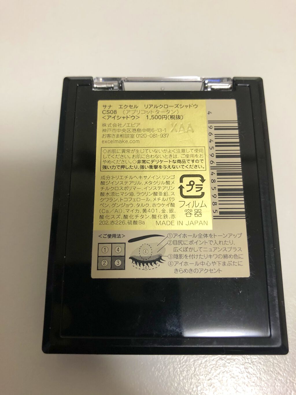 - 1.重ねてもくすまないクリアな発色。ナチュラルに溶け合う絶妙4カラー。 ツヤタイプ(左上・左下カラー):アイホール全体にぼかしたり、目尻へのポイント使いも。 ラメタイプ(右上カラー):アイホール中心や下まぶたにきらめきのアクセント。 マットタイプ(右下カラー):単色で陰影を付けたり、ツヤタイプと重ねてニュアンスをプラス。 2.うっとりするほどリッチな質感で粉飛びしないのに、軽いタッチで伸びて重ねやすいテクスチャー。 3.スクワラン(保湿)配合で目元の乾燥を防ぎます。 [PERFORMANCE] 色と質感の重ね着を楽しむ、ファッション感覚アイシャドウパレット [DESIGN] ・まぶたにひっかからない、なめらかな上質チップ ・薄型コンパクトだからポーチの中でかさばらない [QUALITY] 1.重ねてもくすまないクリアな発色 ナチュラルに溶け合う絶妙4カラー 2.パールの重ね技でまぶたに極上のツヤ感 微細多色 カラーパール 銀コーティング ガラスパール* excel GOLD-MIX処方(金パール配合)* (*右上のシャイニーカラーのみ) 3.うっとりするほどリッチな質感で粉飛び知らず!なのに、軽いタッチで伸びて重ねやすい 4.スクワラン(保湿)配合で目元の乾燥を防ぐ