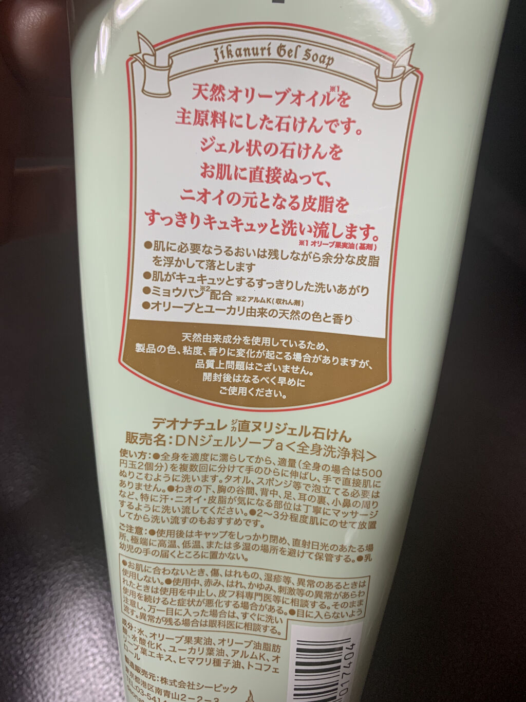 - \11年間ず~っと売上No.1*直ヌリ制汗デオドラントブランド/ 泡立てずに!オリーブのジェルの力で皮脂・ニオイまで**洗い落とす全身洗浄料「直ヌリジェル石けん」 ◆◆商品特長◆◆ 1.ニオイの原因となる酸化した皮脂汚れをすっきりと落としながら、うるおいは保つ 2.肌がキュキュッとする、新感覚のすっきりとした洗いあがり 3.主原料は天然オリーブオイル***で合成香料、着色料、防腐剤、無添加 オリーブとユーカリ由来の天然の色と香り 4.ミョウバン配合**** ◆◆こんな方へおすすめ◆◆ ・日ごろから制汗デオドラントを使っている人 ・いつも使っているボディソープでは汗やニオイがすっきり落とせていない気がする人 ・とにかく汗・ニオイをしっかり落としたいと思っている人 ==注意== ●お肌に合わないとき、傷、はれもの、湿疹等、異常のあるときは使用しない。●使用中、赤み、はれ、かゆみ、刺激等の異常があらわれたときは使用を中止し、皮フ科専門医等に相談する。そのまま使用を続けると症状が悪化する場合がある。●目に入らないよう注意し、万一目に入った場合は、すぐに洗い流す。異常が残る場合は眼科医に相談する。●使用後はキャップをしっかり閉め、直射日光のあたる場所、極端に高温、低温、または多湿の場所を避けて保管する。●乳幼児の手の届くところに置かない。 販売名:DNジェルソープa *インテージSRI+制汗剤市場 2013年5月~2024年4月 ソフトストーンW(販売名:デオナチュレソフトストーンEX(リニューアル前処方)・DN薬用スティックFe)累計販売金額 **ニオイの元となる皮脂を洗浄することによる ***基剤:オリーブ果実油 ****アルムK(収れん剤)