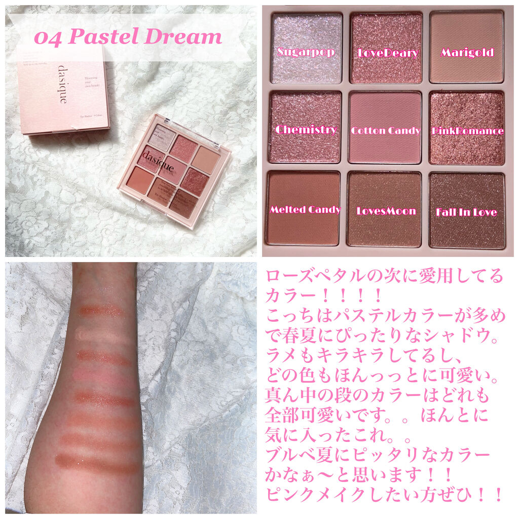 - 【舞台上のバレリーナの繊細な動きと抑制された美しさを再解釈した、dasiqueならではのバレエコアコレクション】 シマー、マット、パールなどバリエーション豊かなテクスチャーで、軽やかにまぶたにフィット。粉飛びしにくく、指先で簡単に美しい仕上がりが叶います。 柔らかいピンクベースから深みのあるシェードまで揃い、1つのパレットで普段使いのデイリーメイクから特別な日の華やかメイクまで幅広く楽しめます。 - 活用しやすいテクスチャーとカラーバリエーションで毎日新しいムードを完成してくれるデイジーク シャドウパレット。 デイリーメイクからポイントメイクまで演出が可能。 感覚的な9種類の色味でムードUP! 多彩でウェアラブルなテクスチャーで高い活用度!