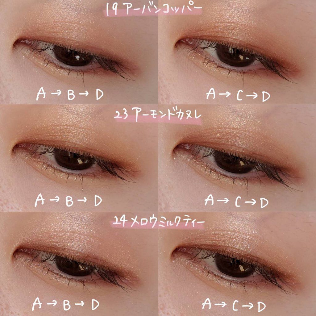 - 1枚のパレットで2つのスタイルが完成! 5色の欲ばりアイシャドウ♥ メインカラーを選んで2つのスタイルが楽しめる! A→B→D でスタイル1 A→C→D でスタイル2 繊細な粉質が、しっとりとまぶたに密着して色落ちを防ぎます。 透明感のあるキラうるトッピングジュエル(繊細ラメ)は、気分によってトッピング!