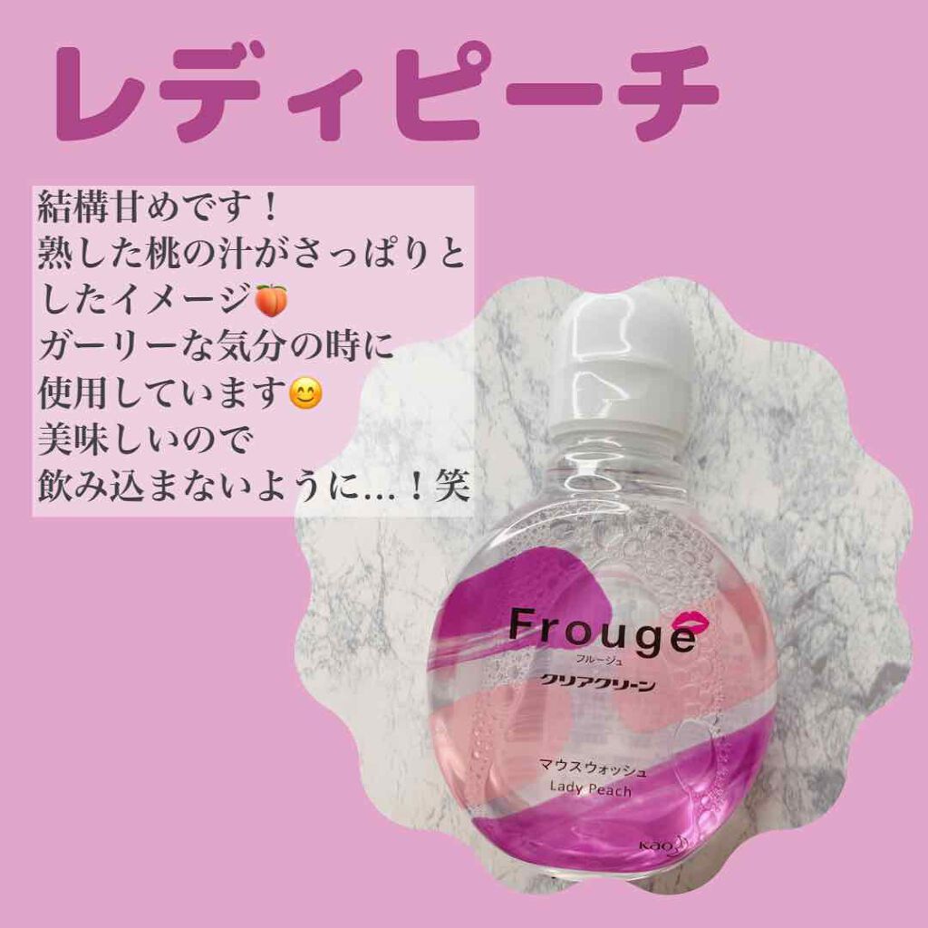 - Frouge(フルージュ)は、息までかわいくメイクするマウスウォッシュ。 フルーツの3つの香味で、いろんな気分の私を楽しめます。 ●カップなしで直接お口に注げるから リップメイクが崩れにくい♡ ●みずみずしいフルーツの香味、カラくない♡ ●オフィスにも置きやすい、コンパクトサイズ♡ ●選べる3つの香味 【Lady Peach】 ほんのりスウィートな香味。華やかな気分の私に。 【Active Grapefruit】 フレッシュで爽やかな香味。凜とした気分の私に。 【Innocent Apple】 すっきりクリアな香味。ピュアな気分の私に。 【医薬部外品】口臭を予防する 【取扱店舗に関して】 取扱店舗の「近くのFrouge取扱店舗はこちら」は、ECサイトでも取り扱いのある店舗になりますので、その他の取扱店舗(ドラッグストアやスーパー等)に関しましては、直接店舗へお問い合わせください。