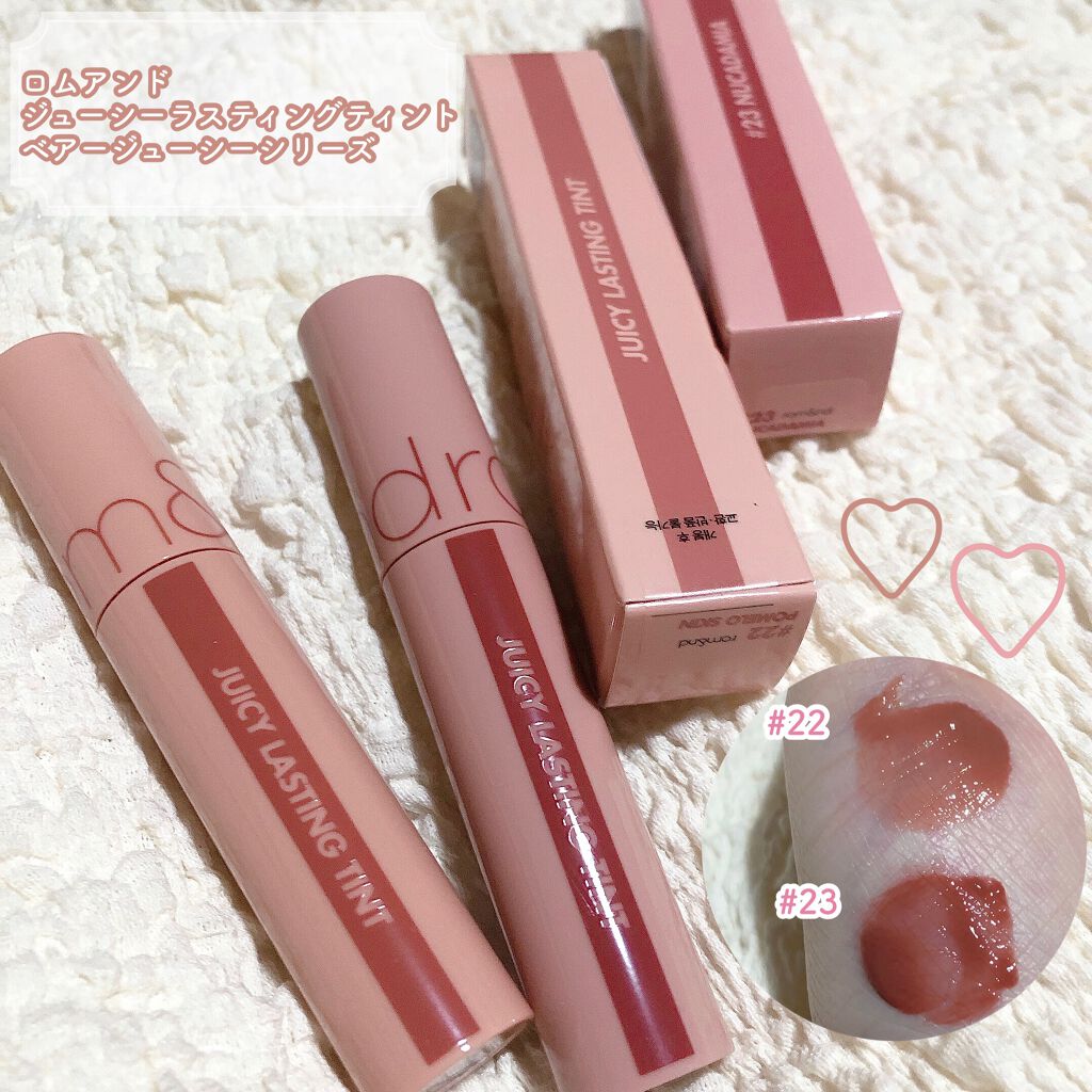 rom&nd ジューシーラスティングティント税込1,320円どれも使いやすいヌーディーカラー🤍⚠️今は商品がリニューアルして、カラー番号が変わってしまっています😓店舗によっては、まだリニューアル前の商品も置いているのですが、色味の参考にでもな...