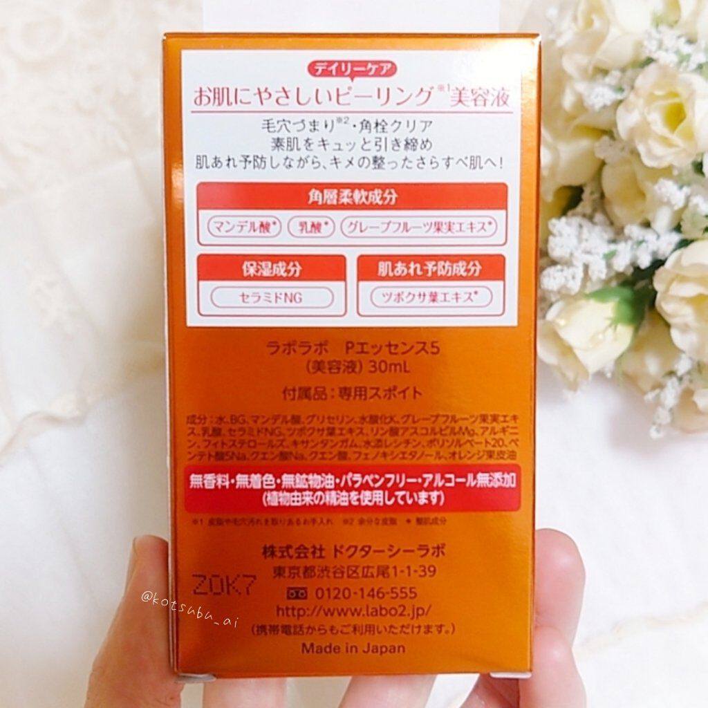 - No.1毛穴ケアブランドラボラボから、肌悩みに合わせて選べる新発想のピーリング美容液が誕生。 クリニックで人気の施術「ミルクピール」を応用し、ホームケアできるように開発しました。角質ケア成分の濃度と、異なる美容液成分の組み合わせで、3タイプからお選びいただけます。 ------------------------------------- ◆スーパー毛穴ピールセラム3(肌悩みレベル★★★) ピールセラム3種共通成分マンデル酸*1に加え、ヒアルロン酸*2・水溶性コラーゲン*3配合で、保湿ケア、毛穴の詰まり、肌のざらつきまで、これ一本でアプローチ。お肌をキュッと引き締め、化粧ノリが良い、キメの整ったうるおいつるん肌へ。 ◆スーパー毛穴ピールセラム5(肌悩みレベル★★★★★) ピールセラム3種共通成分マンデル酸*1に加え、セラミド*4、肌あれ予防成分*5配合で、保湿ケア、毛穴の詰まり、角栓、肌あれ、キメの乱れまで、これ一本でアプローチ。お肌の土台を整え、キメの整ったさらすべ肌へ。 ◆スーパー毛穴ピールセラム10(肌悩みレベル★★★★★★★) ピールセラム3種共通成分マンデル酸*1に加え、ナイアシンアミド*1配合で、保湿ケア、毛穴の詰まり・黒ずみ、角栓、肌あれ、キメの乱れ、疲れ肌、べたつき、ざらつき、凹凸、くすみまで、これ一本でアプローチ。週2・3度のスペシャルケアで、凹凸のないなめらかな肌へ。 ------------------------------------- 化粧水の後に塗るだけ!洗い流し不要で簡単ケアが可能に。 敏感肌の方も安心のやさしい使い心地で、毎日お使いいただけます。 スッと浸透するテクスチャーで、保湿~毛穴ケアまでマルチな効果を発揮します。さらに、安心してお使いいただける5フリー処方で、朝晩ご使用可能です。 無香料・無着色・無鉱物油・パラベンフリー・アルコール無添加 ※植物由来の精油を使用しています ※アレルギーテスト済み(すべての方にアレルギーが起きないというわけではありません) No.1毛穴ケアブランド=出典:富士経済「機能性化粧品マーケティング要覧2019-2020」スキンケア市場皮脂・毛穴ケアカテゴリーにおける2018年の実績 ピーリング=皮脂や毛穴汚れを取り去るお手入れ 黒ずみ=毛穴汚れのこと 疲れ肌=くすんで見える肌状態のこと くすみ=古い角質によりくすんで見えること 浸透=角層まで *1 整肌成分 *2 ヒアルロン酸Na(保湿成分) *3 保湿成分 *4 セラミドNG(保湿成分) *5 ツボクサ葉エキス(整肌成分)