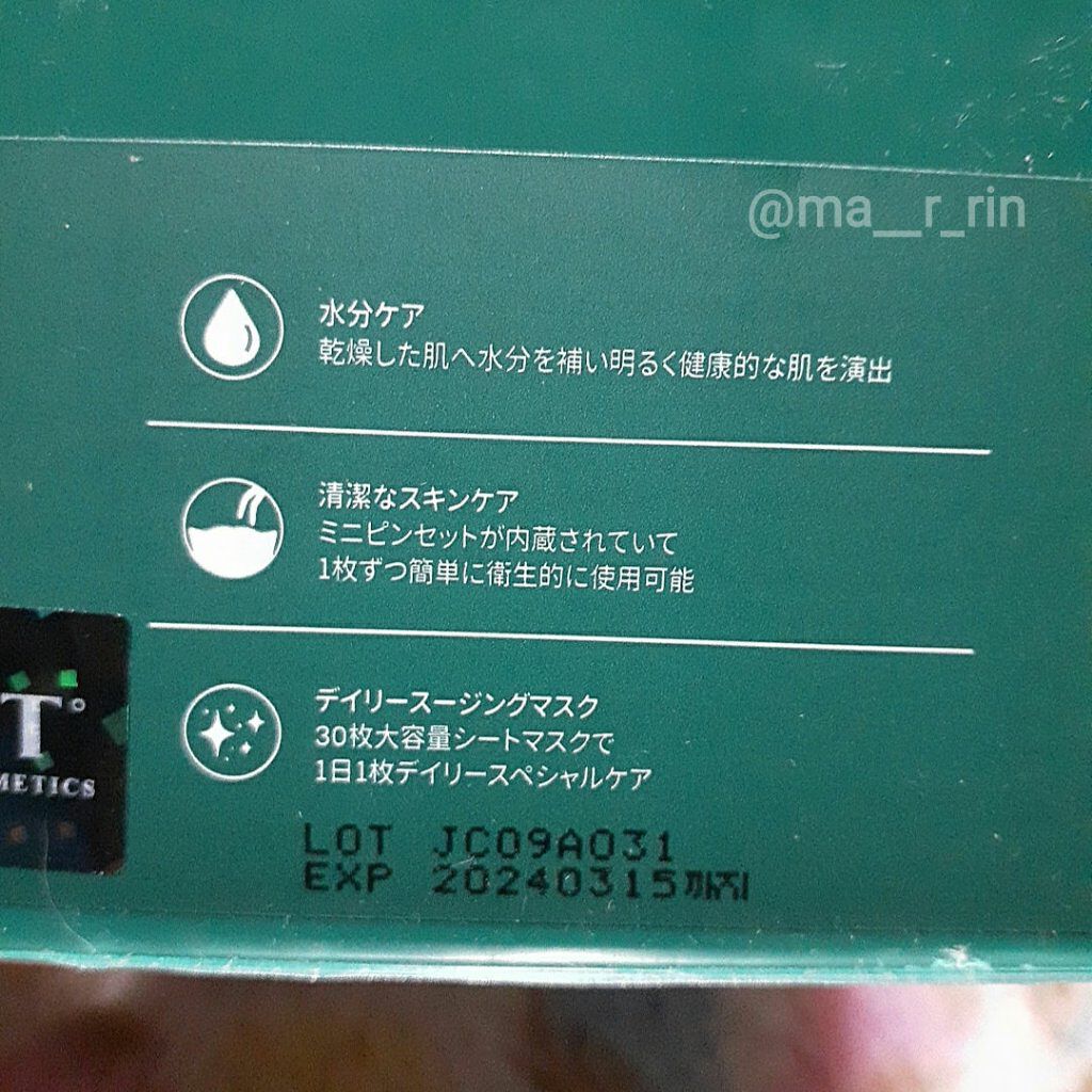 - 1日10分貼っておくだけ!乾いたゆらぎ肌に クイック整肌&水分ケア!1日に1枚ずつ! デイリーケアにぴったりな30枚入りの大容量シートマスク ■TIP メイク前の10分、時短メンテナンスケア。 肌をなめらかにして、化粧ノリが良くなります。 忙しいときはながらケアとしておすすめ! ■使用方法 洗顔後、化粧水で肌を整えた後、 蓋を開けてミニピンセットで1枚取り出します。 シートマスクを顔に均等に密着させ10分後にはがし、 残りの美容液はてのひら全体で優しくなじませます。