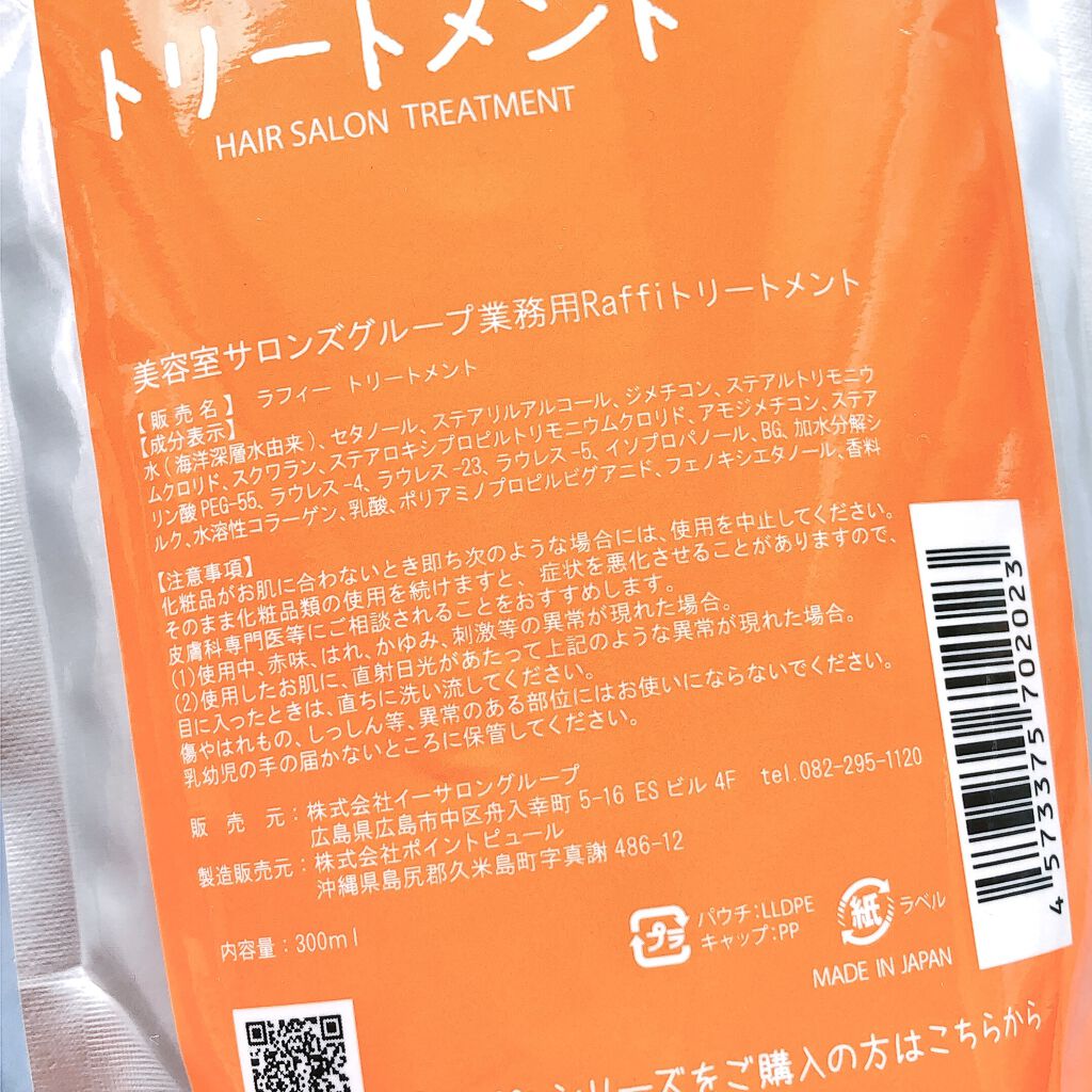 - 【Raffi シャンプー】 「肌のことを考えたサロン品質のオーガニックシャンプー」ほどよい洗浄力と高い保湿力を持ち合わせたシャンプーです。 【Raffi トリートメント】 「髪のことをよく知っているプロのスタイリストが作ったトリートメント」 Raffiシャンプーと相性のいいトリートメント。植物由来のコンディショニング成分を基材に、髪に潤いとまとまりを与える成分で構成されたトリートメント。