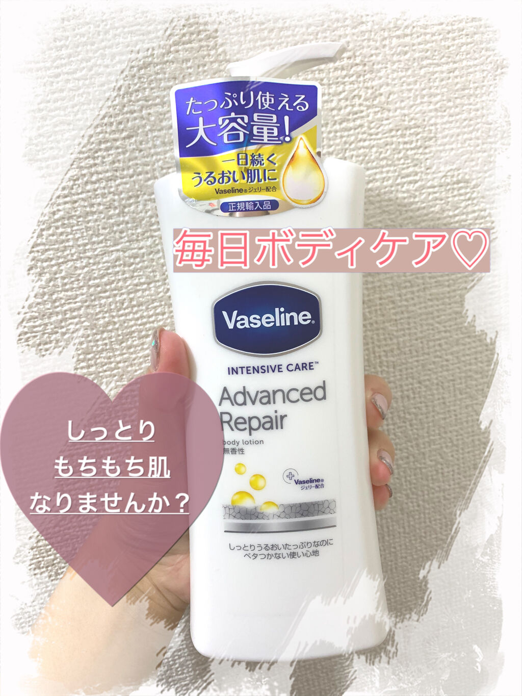 ヴァセリンアドバンスドリペアボディローション400mlアットコスメショッピングで購入しました。(1,078円)肌が弱めの5歳娘と一緒に使用していますが、伸びがよく、翌朝までしっとりします。"セラミド以上の浸透成分配合"というワードの通り、ボデ...
