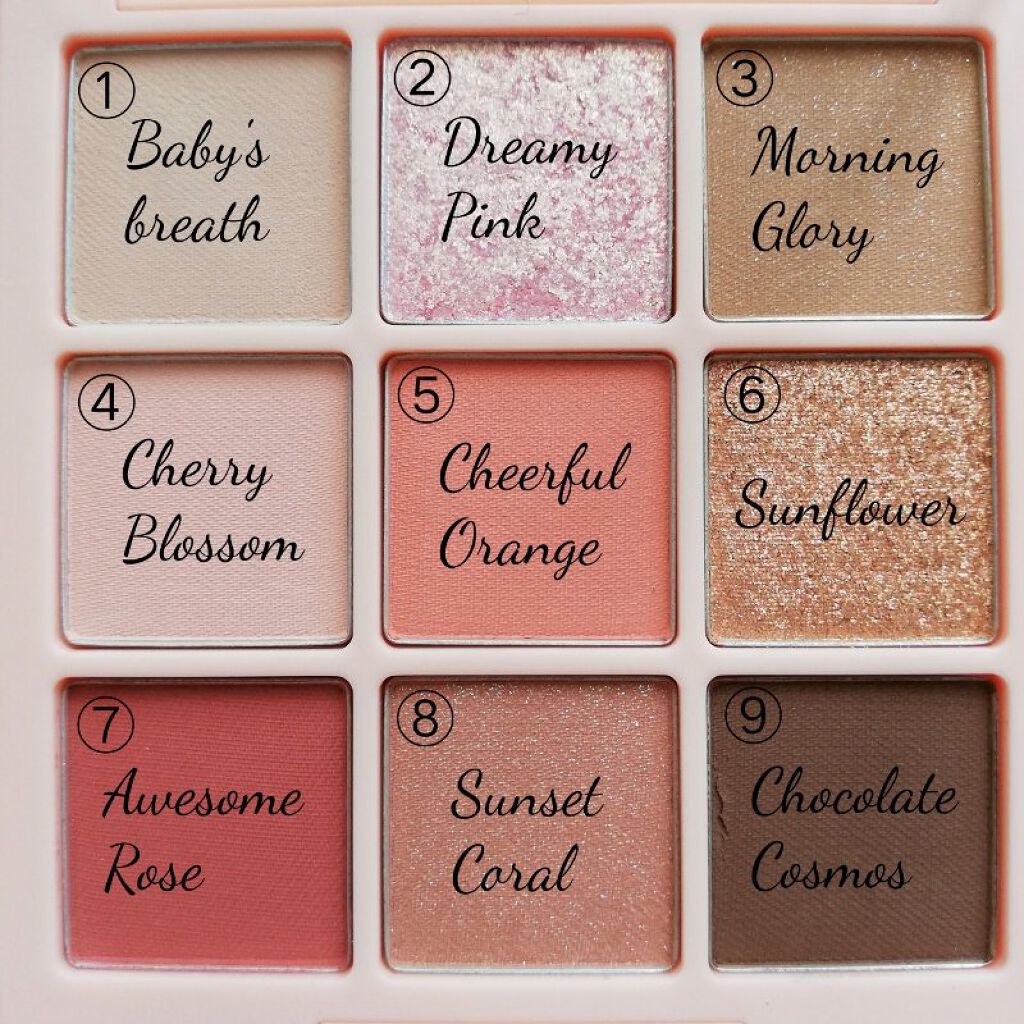 @aplin_japanワンピックアイシャドウパレット01ピンクコーラル¥2,900(Qoo10価格)1Baby’sbreath2Cherryblossom3Morningglory4Dreamypink5Cheerfulorange6Sun...