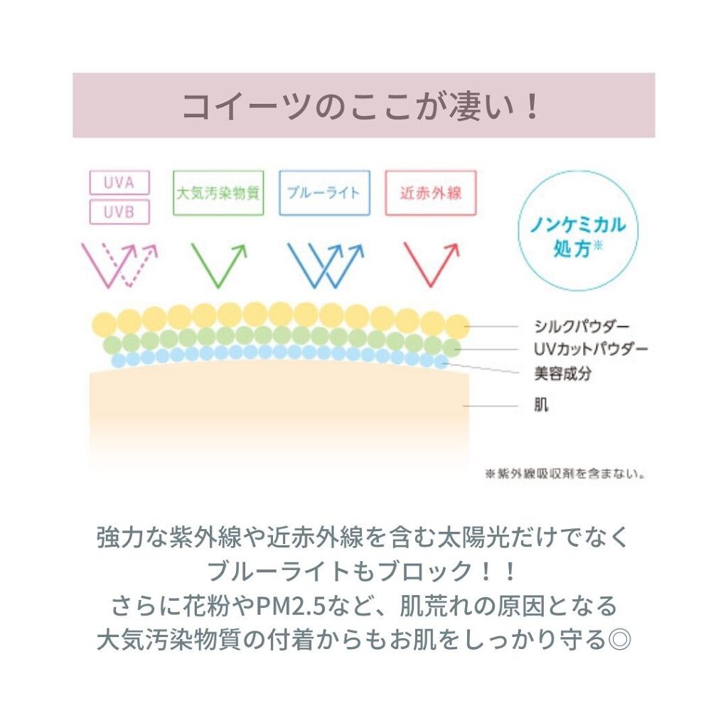 - 何度でも塗り足しOK!テカリを防いで透明感が続くUVケアパウダー。 SPF30、PA+++で、紫外線が気になるときに何度でも塗り足しOK。ブルーライトや近赤外線もブロック。花粉やPM2.5等肌荒れの原因となる大気汚染物質の付着からもお肌を守ります。どんな肌色でもなじむカラーレスタイプで、メイクの仕上げやお直しにもおすすめです。肌なじみの良いシルクパウダー配合で、しっとりさらさら。全18種の美容成分でお肌のうるおいを保ちながら、クリアな肌印象に導きます。合成香料・合成着色料・鉱物油・エタノール・石油系界面活性剤不使用。ノンケミカル処方。