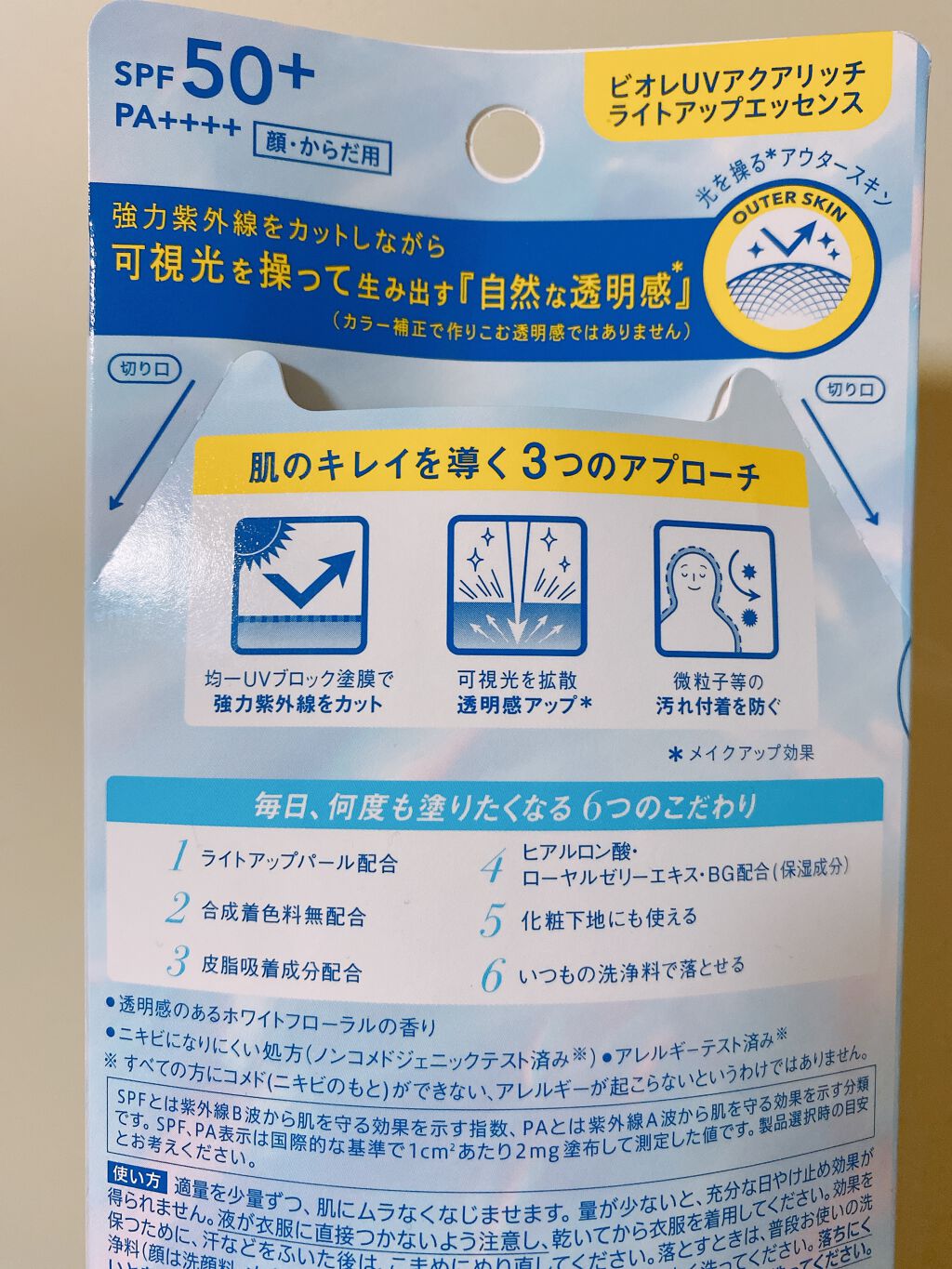 - SPF50+、PA++++ 肌表面にキメより微細な凹凸塗膜をつくり、可視光を多方面に拡散させる可視光コントロール技術により、ふんわり輝く肌に仕上げます。 合成着色料無配合。 伸ばしやすく身体に白残りしにくいので、全身に使いやすく、服やマスクへの色移りも気になりません。 紫外線をしっかり防ぎ、誰が使っても手軽に全身透明感アップ※1できる日やけ止めとして、日常使いにおすすめです。 ※1メイクアップ効果 ※パッケージリニューアル済み。