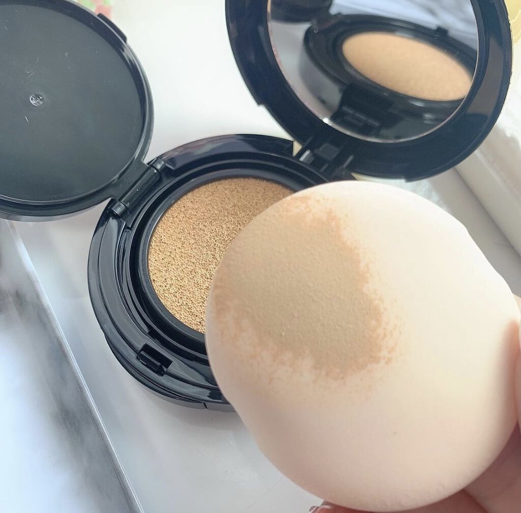 触ってみるとふっかふかで気持ちいい! クッションファンデのパフなので、 しっかりはしているんだけど 表面がふかふか柔らかめで 優しい触り心地が嬉しい🧸🌸 塗ってみると、水々しいので 保湿力はありつつサラサラに✨ 塗ってる感がないのに毛穴レス!!! ニキビなど気になる部分は ぽんぽんと2度のせしたら カバー力もめっちゃある🙆♀️🙆♀️ 水々しいので乾燥も感じにくく 使い心地とても良い( ・ω・ )/💓 1日さんざん喋り倒して、 帰宅したマスクには… 結構ファンデーションついてたけど ファンデ落ちたなぁ💦って感じの むけた感は全然ないので不思議🙄🌸