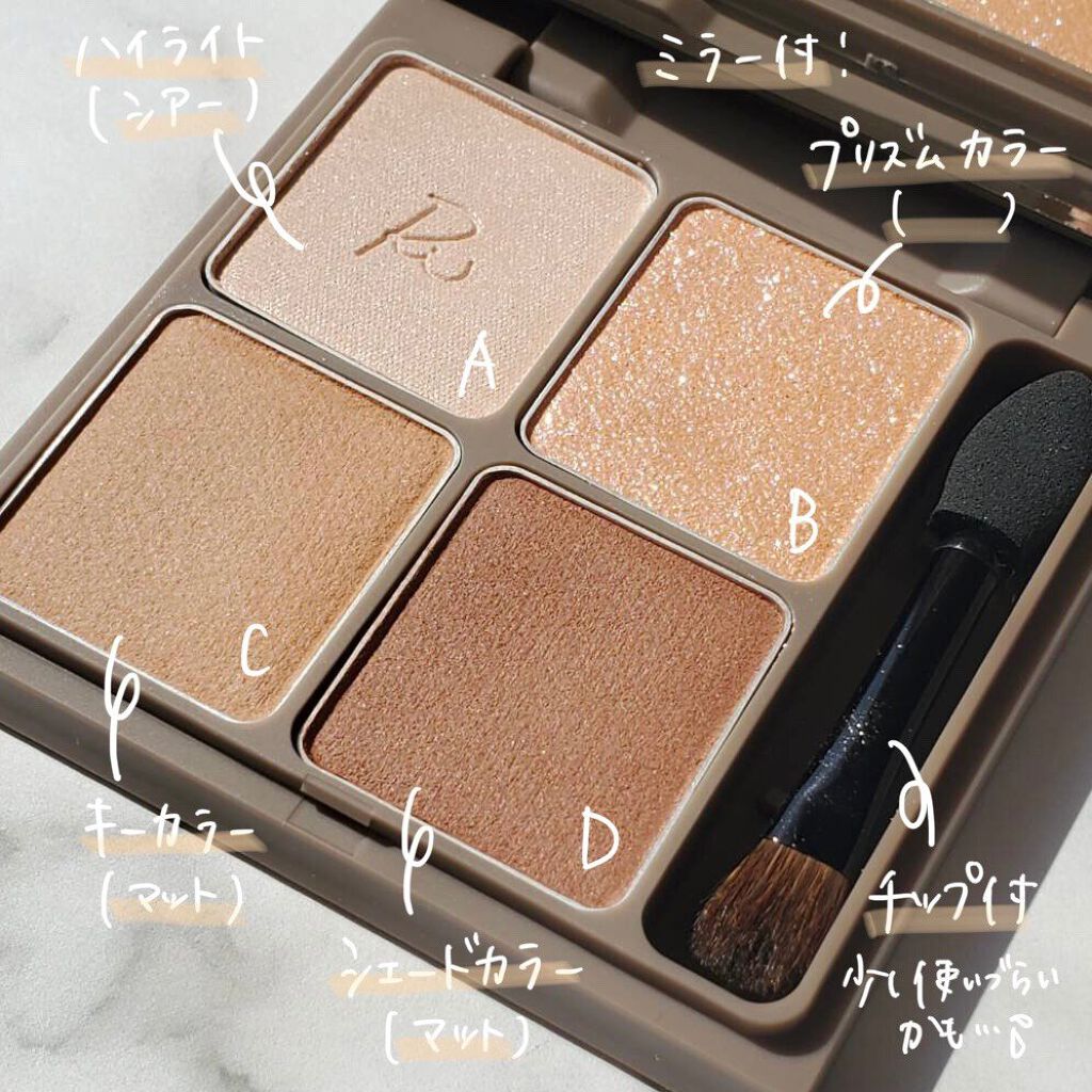 - 2021年3月15日(月)予約販売開始 色×光×質感を1つに詰め込み、毎日のアイメイクのバリエー ションを膨らませる4色のアイシャドウパレット。 ・発色・質感を調整しやすいチップ&ブラシ ふんわり仕上げたいときはブラシ しっかり発色させたいときはチップを その日の気分に合わせたアイメイクが楽しめる ・ 毎日のメイクが楽しくなる4つのカラー ・こだわりの3つの質感 シマー・プリズム・マットのテクスチャー それぞれのカラーがしっかり色づきピタッと密着 ●保湿美容液成分:セラミド・ヒアルロン酸・モモ葉エキス 配合。 ●ミラー・チップ&ブラシ付き。