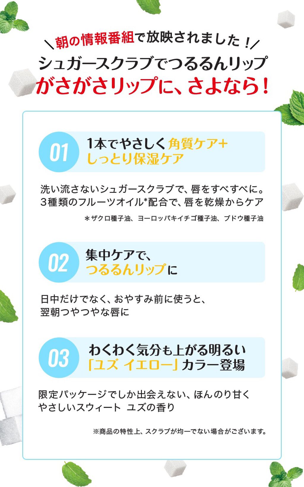 - 洗い流さなくてもよいシュガースクラブで、やさしく唇の角質をオフ。 そして、3種類のフルーツオイル*配合で保湿効果も高く、乾燥から唇を守ります。 ひと塗りで、ぷるんとすべすべ、キスしたくなる唇に! *ザクロ種子油、ヨーロッパキイチゴ種子油、ブドウ種子油