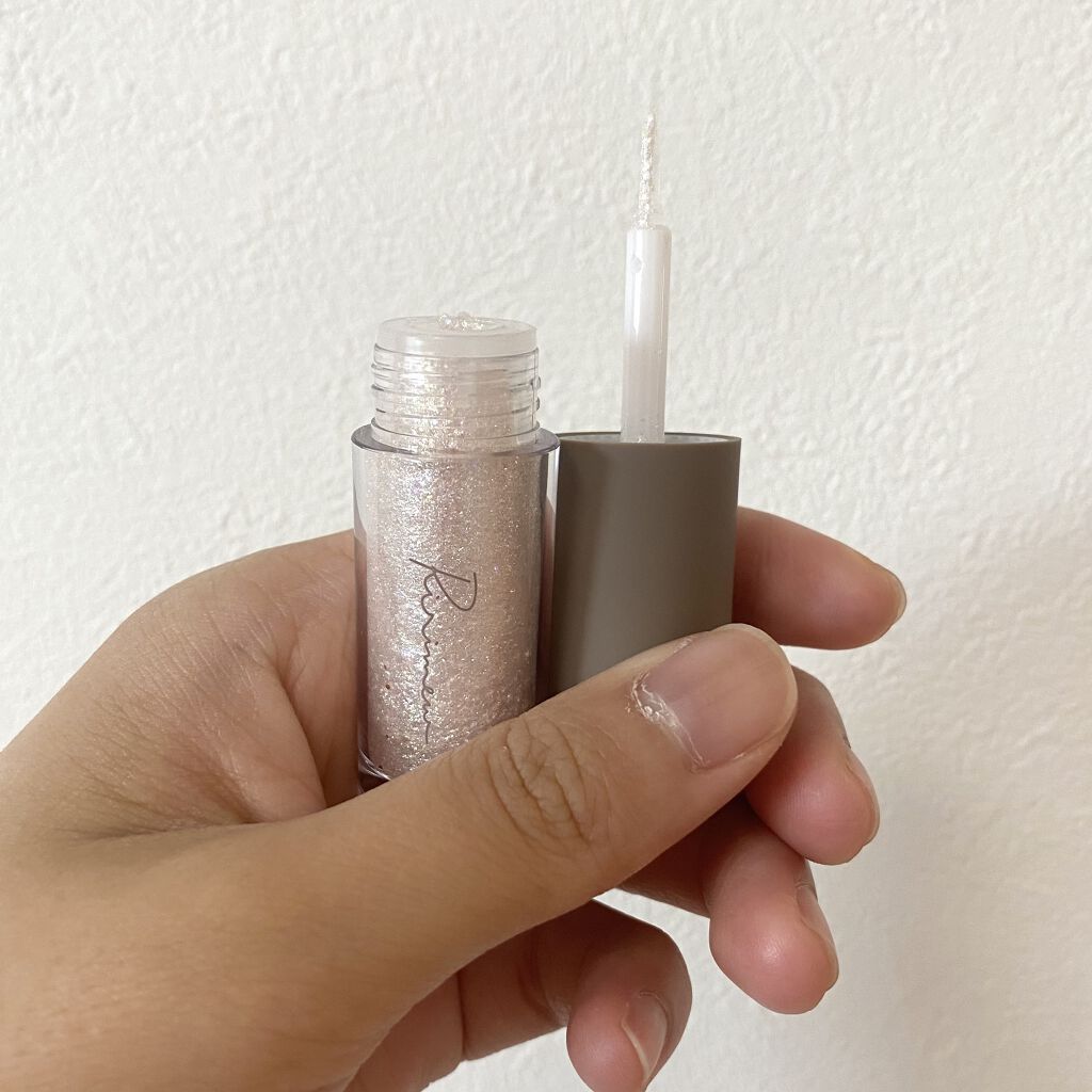 ベースがベージュ系のピンクで、シルバー、ゴールドの細かいラメが入っています✨ アプリケータ(塗るところ)が極細のシリコンなので細かく塗ることができ、塗りすぎたということが起こらないのが尚良いと思います🙆♀️ 個人的に感じたのは、他のグリッターよりも見た目の感じで量が多そうなので減りが遅そうでコスパも良いと感じました! ピンクのグリッターですがそこまで色は強くなく、肌なじみの良いピンク系のグリッターになっています💖 大粒〜小粒のラメがぎっしりと入っていて、つけるだけで存在感のある目元になります✨ ベースのカラーは3CEと似たようなベージュピンクですが、こちらは小粒のシルバーラメがギラギラとした感じになっています✨ ベースカラーがベージュピンクなのでかえって肌なじみがよくナチュラルで使いやすいと思います。 筆は細めですが量が多くつくので調整してから乗せることをオススメします🙂パッケージが細いので持ち運びにも便利だと思います!