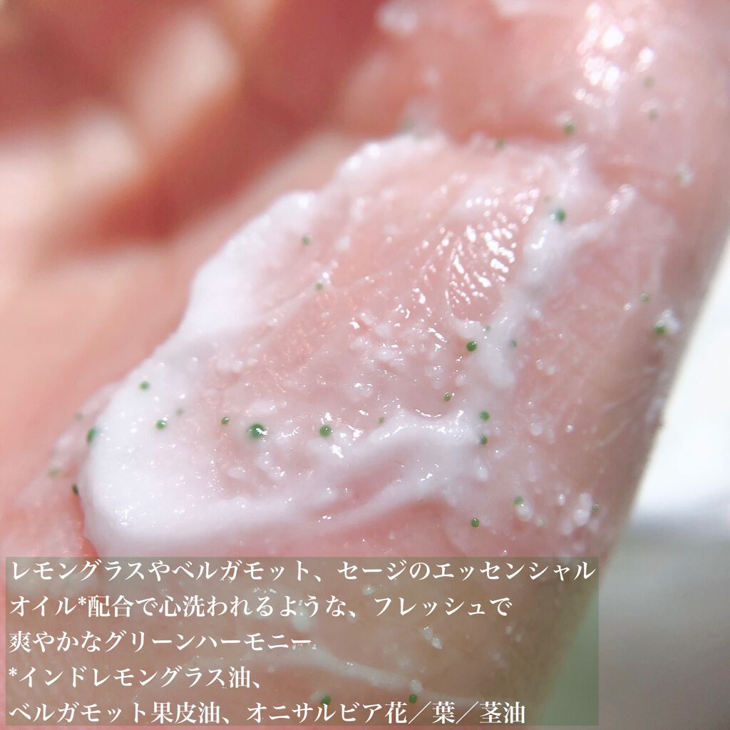 - <数量限定> 洗顔と角質ケアを同時に叶える、泡立て不要のフェイススクラブ。 なめらかなテクスチャーのクリームが、乾燥しやすい肌をやさしく包み込みます。 丸く加工されたホホバ由来のスクラブ粒子が、肌の上をやさしくすべるようにマッサージし古い角質や毛穴の汚れをすっきりと取り除きます。 ミネラル豊富な死海の塩とジェリコローズ、抹茶エキスが肌に潤いを与え、なめらかなツヤ肌に導きます。 潤いに満ちたしっとりした洗い上がりで、潤いと透明感が溢れるクリーンなピュア肌へ。 レモングラスやベルガモット、セージのエッセンシャルオイル配合で、心洗われるような、爽やかなグリーンハーモニーの香りを楽しめます。