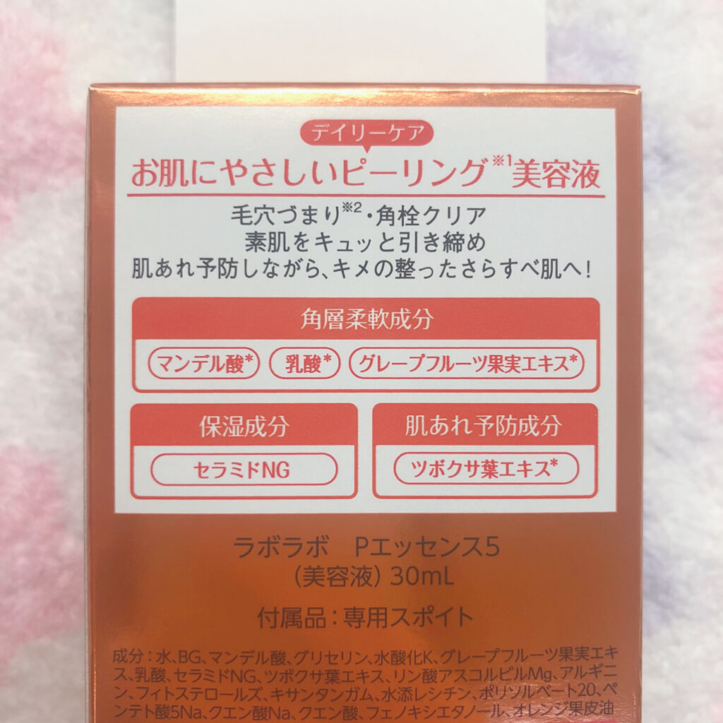 - No.1毛穴ケアブランドラボラボから、肌悩みに合わせて選べる新発想のピーリング美容液が誕生。 クリニックで人気の施術「ミルクピール」を応用し、ホームケアできるように開発しました。角質ケア成分の濃度と、異なる美容液成分の組み合わせで、3タイプからお選びいただけます。 ------------------------------------- ◆スーパー毛穴ピールセラム3(肌悩みレベル★★★) ピールセラム3種共通成分マンデル酸*1に加え、ヒアルロン酸*2・水溶性コラーゲン*3配合で、保湿ケア、毛穴の詰まり、肌のざらつきまで、これ一本でアプローチ。お肌をキュッと引き締め、化粧ノリが良い、キメの整ったうるおいつるん肌へ。 ◆スーパー毛穴ピールセラム5(肌悩みレベル★★★★★) ピールセラム3種共通成分マンデル酸*1に加え、セラミド*4、肌あれ予防成分*5配合で、保湿ケア、毛穴の詰まり、角栓、肌あれ、キメの乱れまで、これ一本でアプローチ。お肌の土台を整え、キメの整ったさらすべ肌へ。 ◆スーパー毛穴ピールセラム10(肌悩みレベル★★★★★★★) ピールセラム3種共通成分マンデル酸*1に加え、ナイアシンアミド*1配合で、保湿ケア、毛穴の詰まり・黒ずみ、角栓、肌あれ、キメの乱れ、疲れ肌、べたつき、ざらつき、凹凸、くすみまで、これ一本でアプローチ。週2・3度のスペシャルケアで、凹凸のないなめらかな肌へ。 ------------------------------------- 化粧水の後に塗るだけ!洗い流し不要で簡単ケアが可能に。 敏感肌の方も安心のやさしい使い心地で、毎日お使いいただけます。 スッと浸透するテクスチャーで、保湿~毛穴ケアまでマルチな効果を発揮します。さらに、安心してお使いいただける5フリー処方で、朝晩ご使用可能です。 無香料・無着色・無鉱物油・パラベンフリー・アルコール無添加 ※植物由来の精油を使用しています ※アレルギーテスト済み(すべての方にアレルギーが起きないというわけではありません) No.1毛穴ケアブランド=出典:富士経済「機能性化粧品マーケティング要覧2019-2020」スキンケア市場皮脂・毛穴ケアカテゴリーにおける2018年の実績 ピーリング=皮脂や毛穴汚れを取り去るお手入れ 黒ずみ=毛穴汚れのこと 疲れ肌=くすんで見える肌状態のこと くすみ=古い角質によりくすんで見えること 浸透=角層まで *1 整肌成分 *2 ヒアルロン酸Na(保湿成分) *3 保湿成分 *4 セラミドNG(保湿成分) *5 ツボクサ葉エキス(整肌成分)