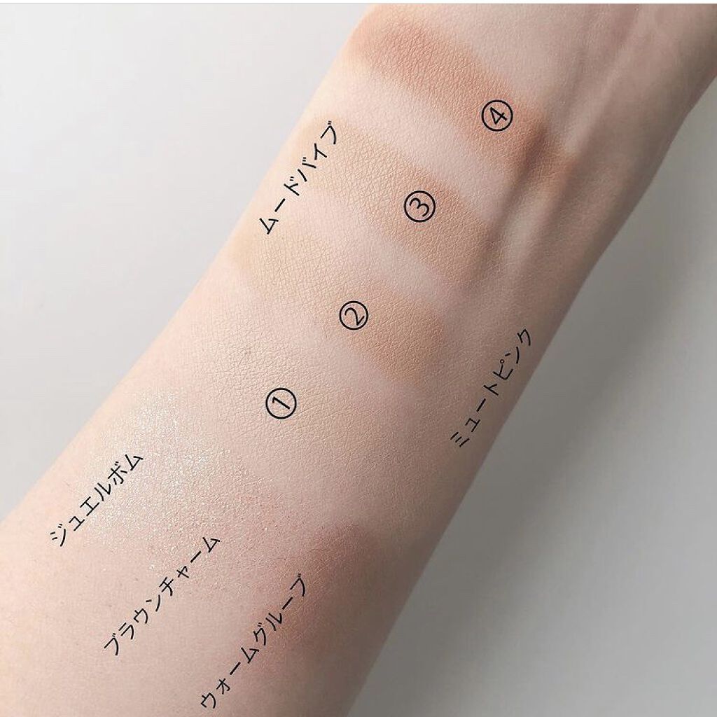 指先で塗りやすい粉質で、コンパクトで持ち運びにも便利なアイパレット。 無駄がない4色構成でメイクの時短にも🙆♀️ 写真だと分かりづらいですが、左上のカラーは全体的にシルバーの細かいラメ入り。 グリッターもあるので、デイリーからしっかりメイクまで幅広く使えます。 ちょっと気になる左上のピースマーク✌🏻はハンディジェスチャーでパレットごとに違う柄。 パーソナルカラー別に1〜5号までのカラー展開。自分に合うカラーが見つけやすくなっています。 今回のカラーはブルベ推奨です。