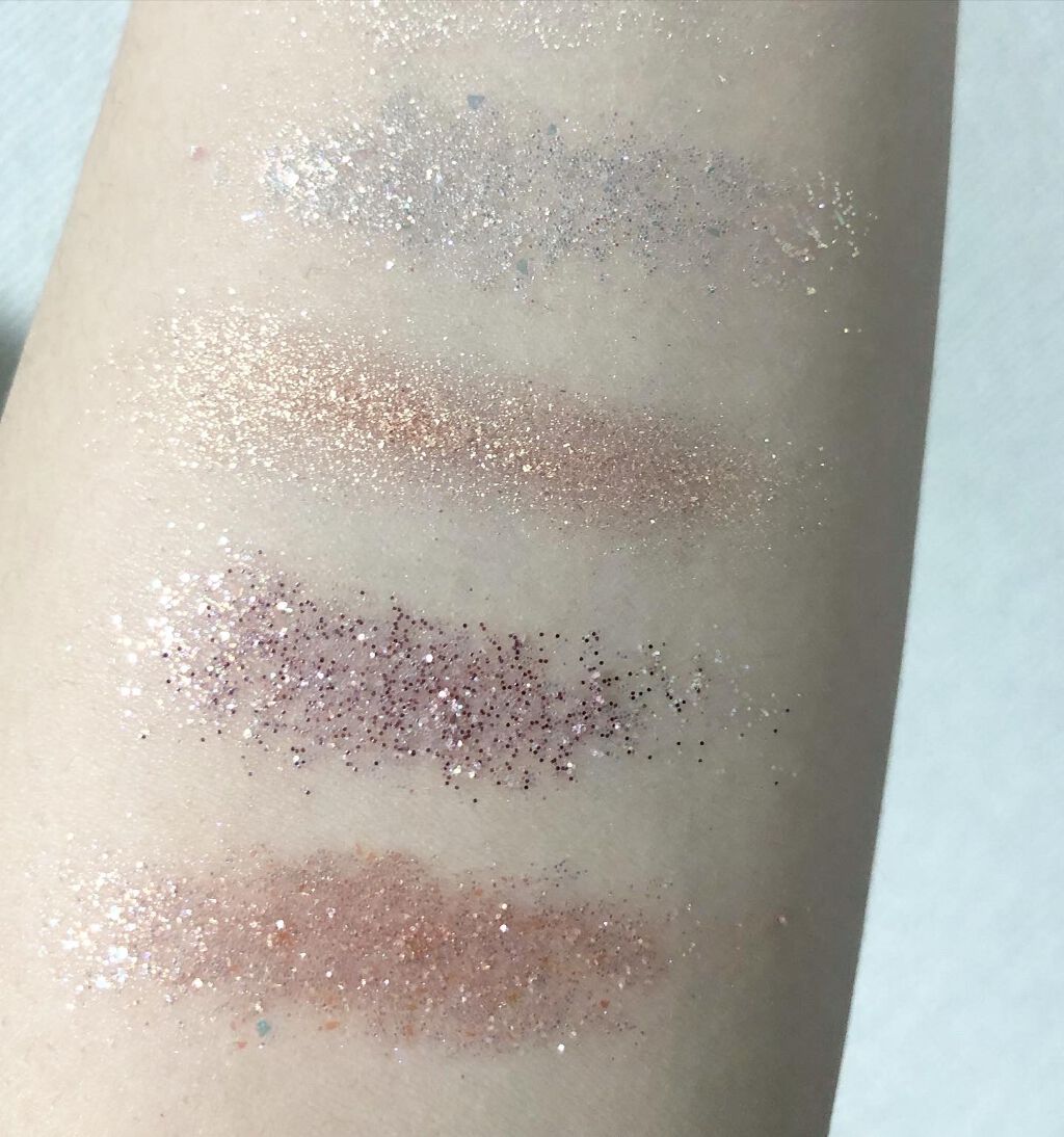 アディクションのアイシャドウです☺️💓手にのせている順番は上から67番プライベートビーチ68番ノスタルジア69番フラッシュバック90番ハーフムーン99番ミスユーモアです🤗💓キラキララメラメアイシャドウベースをしっかりつけるとラメも飛びませんそ...