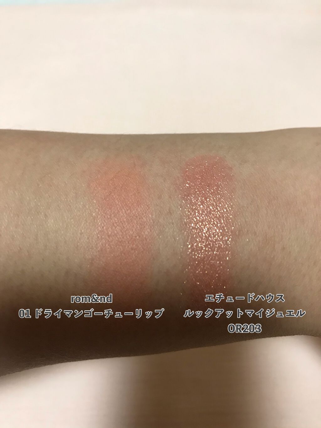 質感…軽くてふわっとしているけど、まぶたに塗るとピタッと密着します。 発色…リキッドなので、しっかり発色します、ラメが入っているのでキラキラ綺麗です。 持ち…朝メイクして、夕方までしっかり残っていたので、持ちはいいと思います。 単色で使うのもかわいいし、もちろん手持ちのオレンジ系やゴールド系のアイシャドウと合わせて使うのもかわいいです。