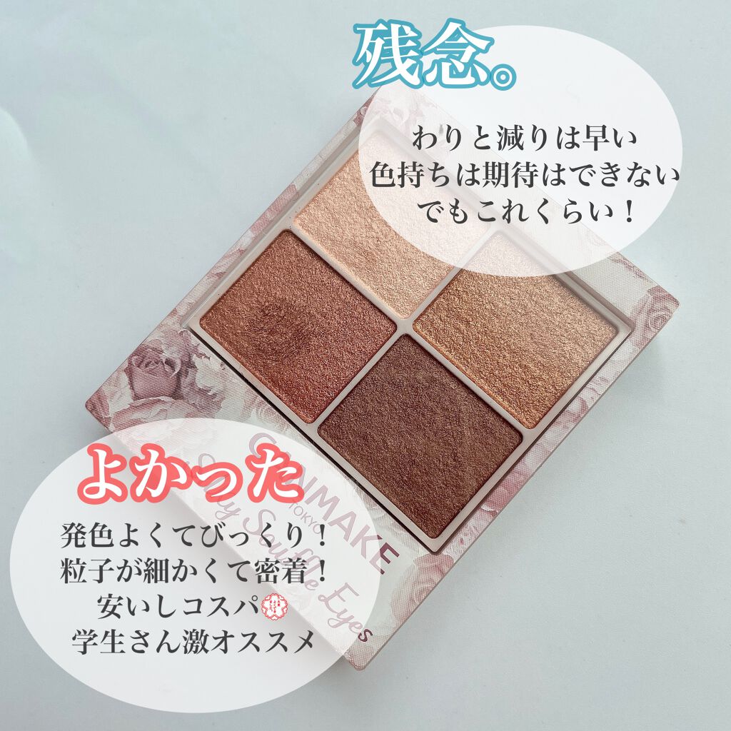 めちゃくちゃ安いのにしっとりふわふわ粉質で粉飛び全然しない!! 色持ちもアイシャドウベースなくてもかなり良い🥹 06トパーズピンクの色がブルベ大喜びカラーすぎてあまりに可愛い!!!!!