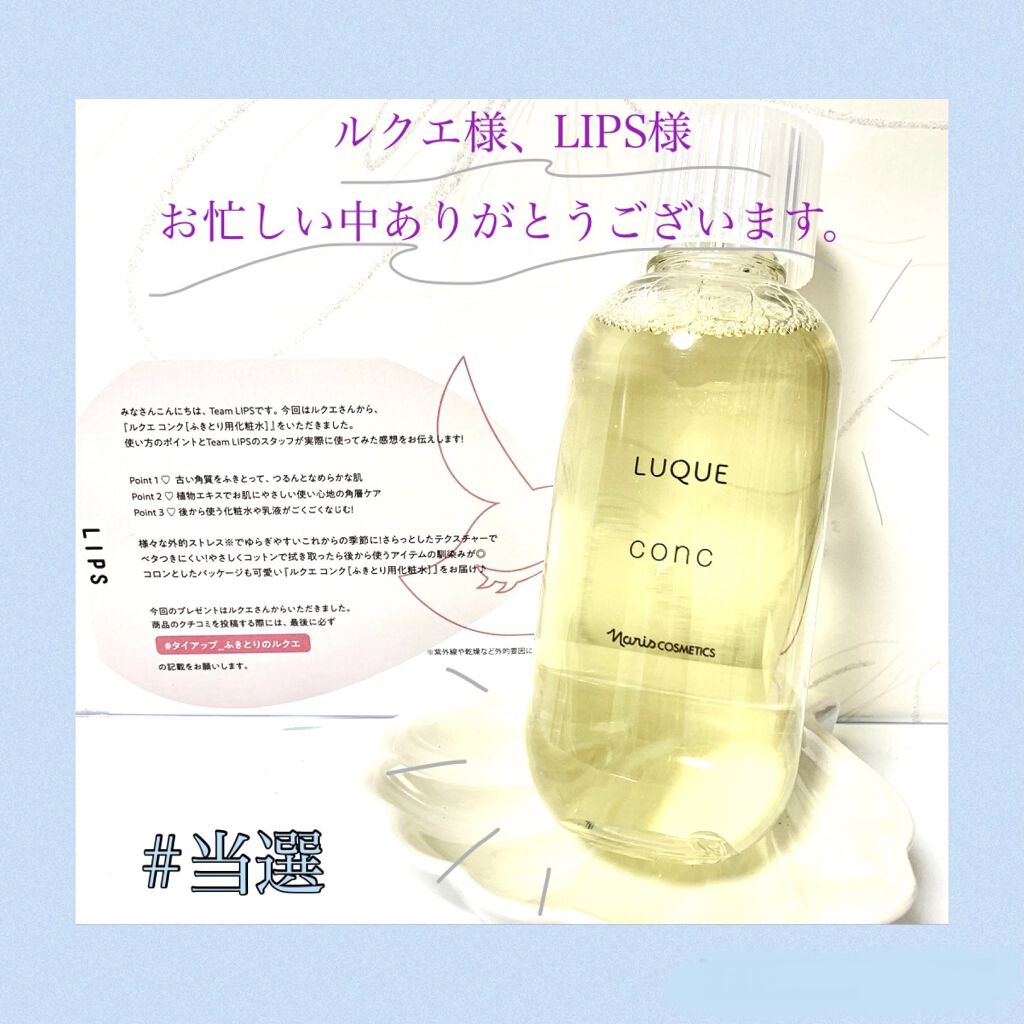 - ■毛穴、ザラつき、くすみ※1が気になる方に、不要な角質をふきとって、つるんとなめからかな肌へ。 ナリスのふきとり化粧水は、5年連続国内売上シェアNO.1※2 肌にとって余分な老化角質をおだやかに取り除き、素肌が持つ本来の美しさを引き出すルクエのコンク(ふきとり用化粧水)はナリスの80年以上続く研究開発によって誕生しました。 ●キレイのこたえは、ふきとり化粧水という選択。 植物保湿成分で古い角質をやさしくオフして、次に使うスキンケアアイテムのなじみをサポート。日々変化する肌をすこやかに整えます。毎日の“ふきとり習慣”で理想の肌に近づきましょう。 ●厳選した3つの植物の力で角層ケアをサポート。 ・柔らかくほぐして、取り除きやすくする「ヨクイニンエキス」※3 ・潤いを与え、健康的な角層へ導く「月見草エキス」※4 ・潤いを逃さず閉じ込める「白花豆エキス」※5 【使用方法】 1. 朝晩2回、洗顔後の後に。 2. コットンに8〜10滴程度(500円玉大)を含ませます。目安は、コットン裏側に染み込む程度。 3. できるだけ力を入れずに、やさしくなでるように顔全体を拭き取ります。 ※1古い角質による ※2ナリス化粧品 2015~2019年度 「ふきとり用化粧水」販売動向調査 TPCマーケティングリサーチ株式会社調べ※3 ハトムギ種子エキス(保湿成分) ※4 メマツヨイグサ種子エキス(保湿成分) ※5ベニバナインゲン種子エキス(保湿成分)