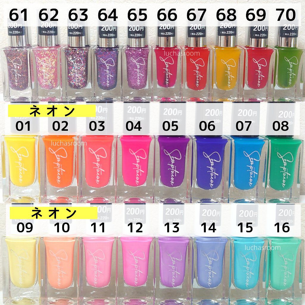 ⚠️更新版投稿しました⚠️こちらのハッシュタグからとべます▶#カラーチャートluchasroom完全保存版‼️ダイソーでネイルポリッシュを買うときに必携!ダイソーの3大ネイルポリッシュ、GENEネイル、フレンドネイル、ソンプチューの全色カラー...