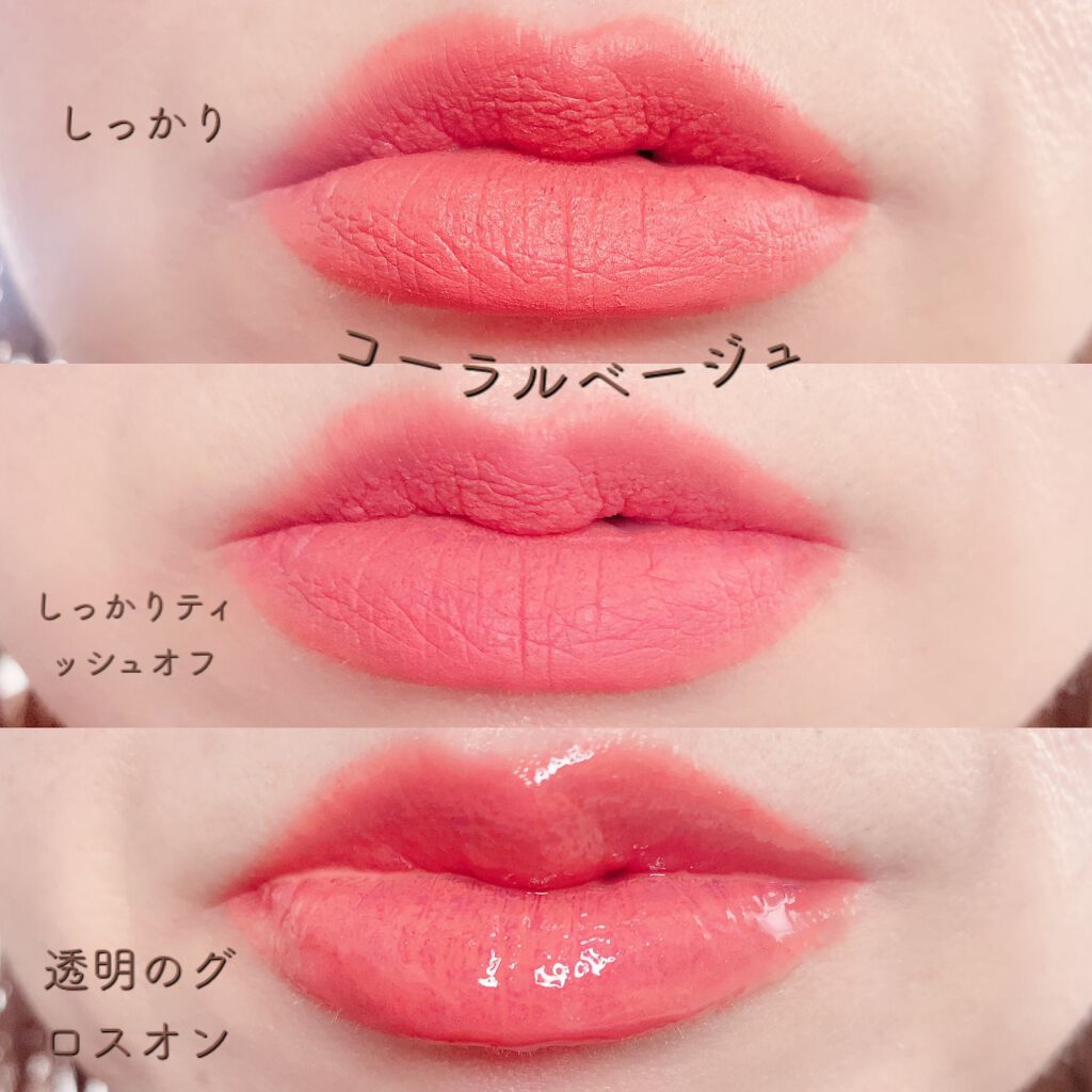 まず見た目が可愛くって、そして思ってたよりもかなりのミニサイズ・・⭕️ シアータイプのリップでラメがチラチラ見える控えめの発色のリップだょ✨✨ ティッシュオフしてもほんのり色が残ってくれて、ラメ感とツヤもほんのり残るのね・・✨✨ 程よい血色感が続いてくれて、つけ心地としては圧迫感が全くなくって、艶々瑞々しい感じ🥰 潤いもチャージできて、乾燥知らずなのもいい⭕️