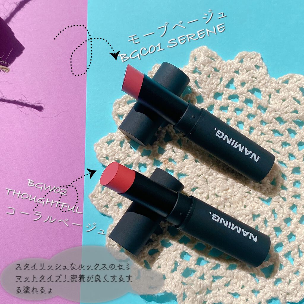 韓国コスメブランド「NAMING.」の人気商品『スマッジセミマットリップ』#01モーブベージュ#02コーラルベージュ全10カラーのうち、私が選んだのはこの2つです。まず、仕上がりが綺麗。セミマットですが、滑らかに塗れます。派手すぎないカラーで...