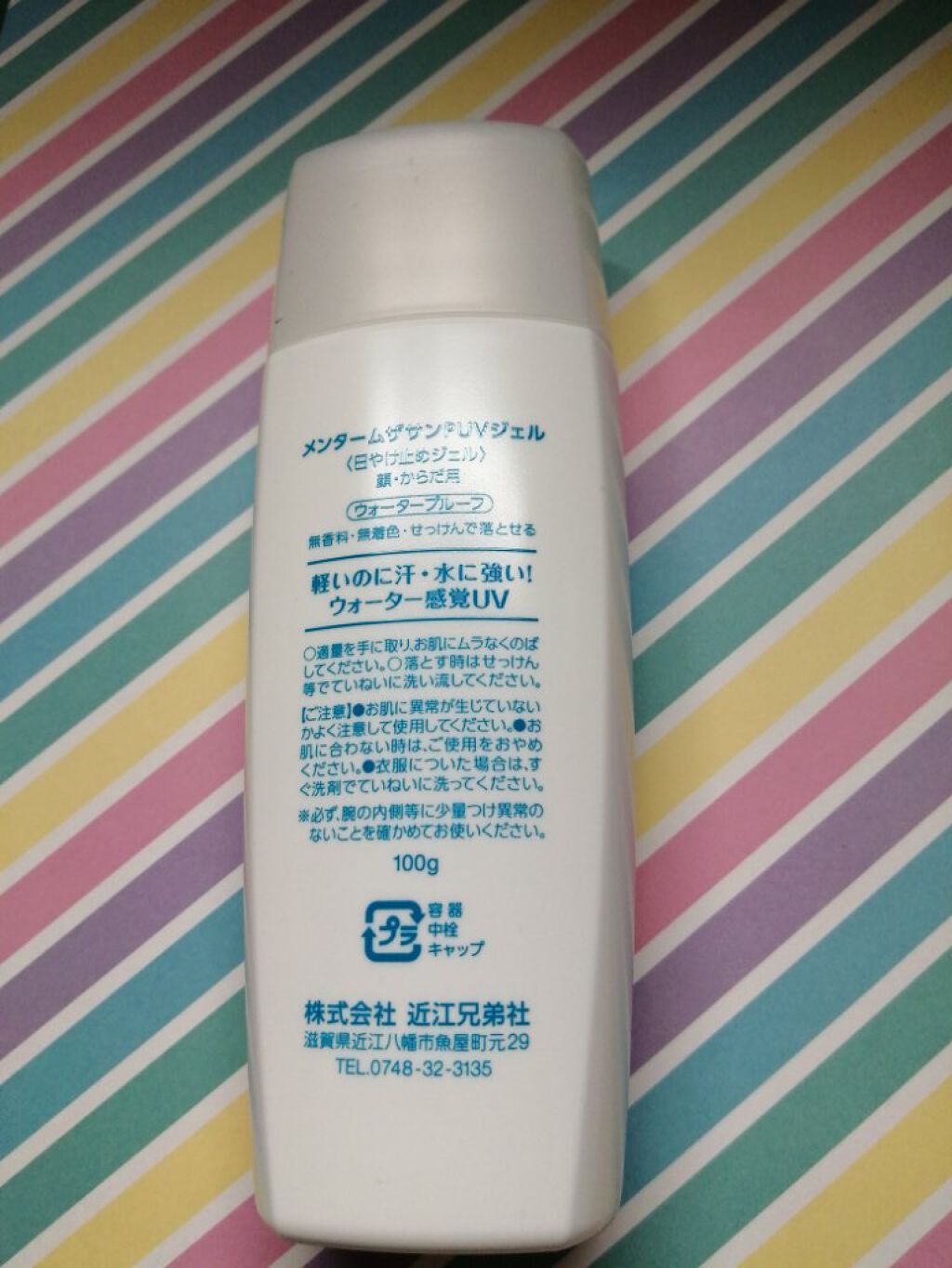 メンタームザサンパーフェクトUVジェル今日母が買ってきてくれた日焼け止めです。石鹸で落とせます。😁😁😁100g入ってます。匂いは、普通の日焼け止めの匂いであんまりいい匂いではありません。😐😐😐まだ、今日使い始めたばかりなのでなんとも言えません...