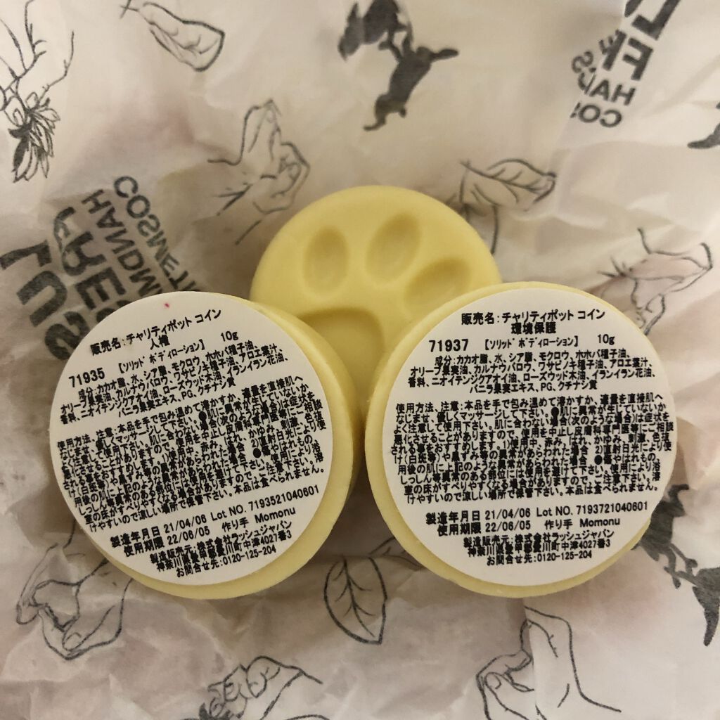 LUSHにふら~っと立ち寄った時に購入したチャリティポットコインです。こちらは10gと小ぶりな固形タイプのボディローションになります。全身に使えて保湿力も高いです!アロエエキスが潤いをお肌に与えて、健やかな状態にしてくれます。さらに、たっぷり...