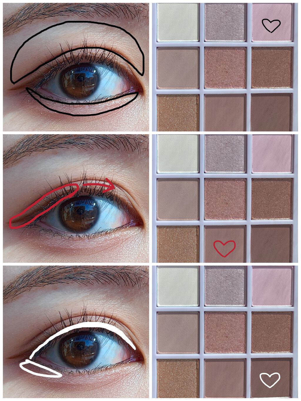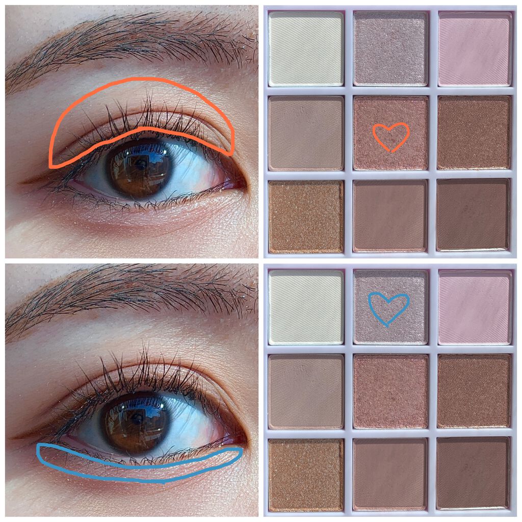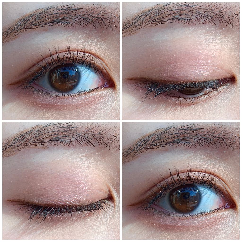 このメイクのポイントは、塗り方にあります✨ 色をがっつり分けて塗るのが、意外と盛れちゃうのです♡ 小豆色を忍ばせて、京都気分を味わいましょ🍁 1.左上の透けツヤ色で目を囲む 2.右上のピンクを二重幅にのせる 範囲は目頭から半分の位置 ❗️ぼかしたりせずそのままの発色で 3.左下くすみピンクを二重幅にのせる 範囲は②で塗らなかった部分 ❗️このときもぼかさない 4.ブラウンをうすーく目のキワにライン状にのせる ②と③のときに色を混ぜないのがポイント💕