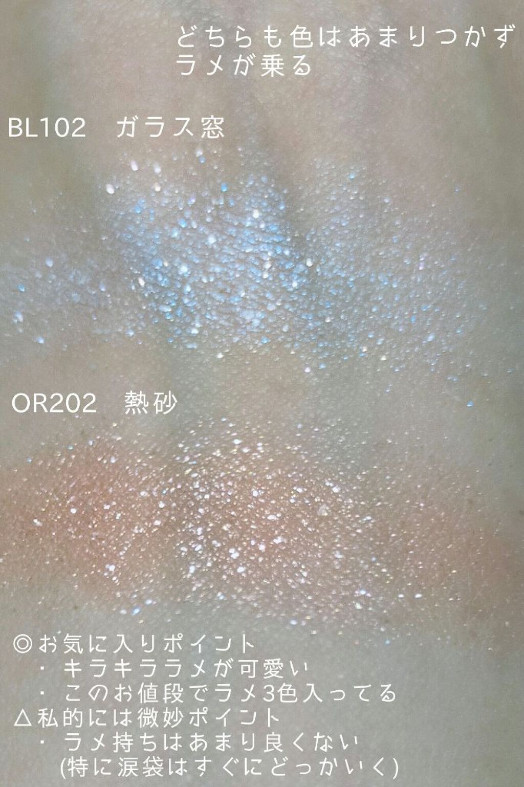 - 思いのままにカスタムできる 大粒ラメがきらめくアイシャドウ ○輝度の高い大粒ラメが密着しラメ落ちしないから、瞳全体輝きを増してより華やかな印象が続く -フローティングベース処方 ○ラメがチラチラ浮いているように輝き、華やかに、そして立体感のある目もとへ。 【色調】 〈フローティング:大粒ラメがチラチラ浮いているように見える仕上がり〉