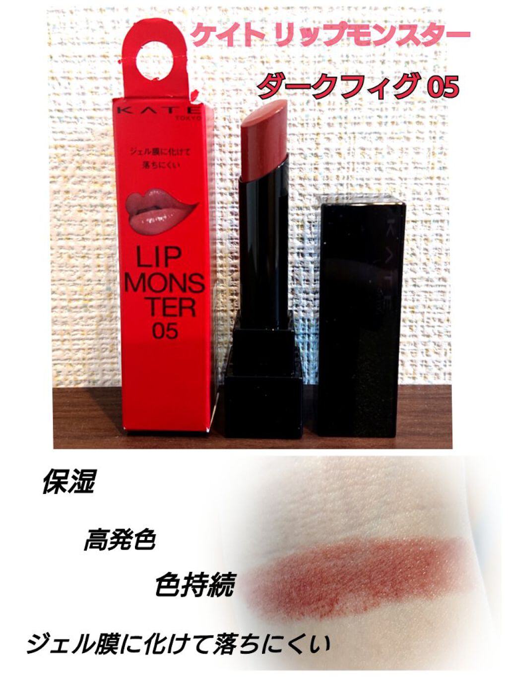 KATEケイトリップモンスター05 ダークフィグくすみが強いブラウンレッドカラー。でも、透け感もあって可愛い。塗ってしばらく放置するとティッシュオフしてもつかないし色持ちもよくてホント助かる!イエベもブルベも使いやすいニュートラルカラーじゃな...