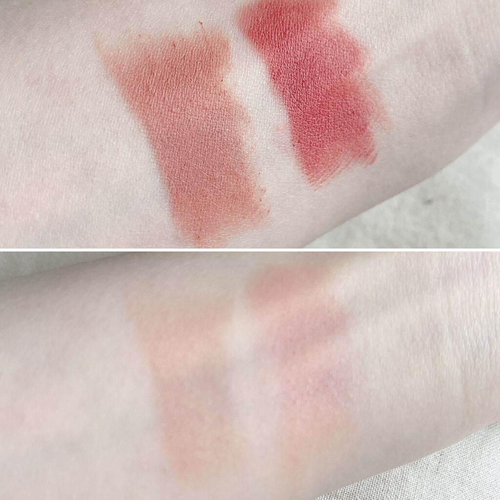 バフっと感がないするするなめらかなマットブラー、つけ心地は軽くティント具合もマイルド✍️ ヌードすぎずナチュラルなピーチ感で使いやすい🍑 思ったよりヌードすぎず、やわらかなピーチ感