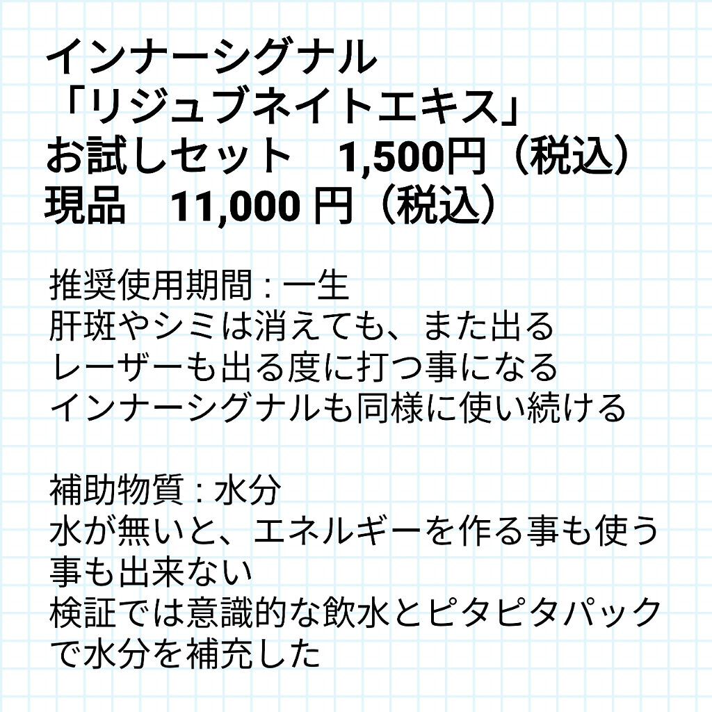 インナーシグナルは名前は知っていましたが、使用したことがなく、今回購入して使ってみました。私自身、大塚製薬が作ったコスメはサイエンスに基づいて作られている根拠が好きで、以前からよく使用しています。インナーシグナルリジュブネイトエキスは、年齢と...