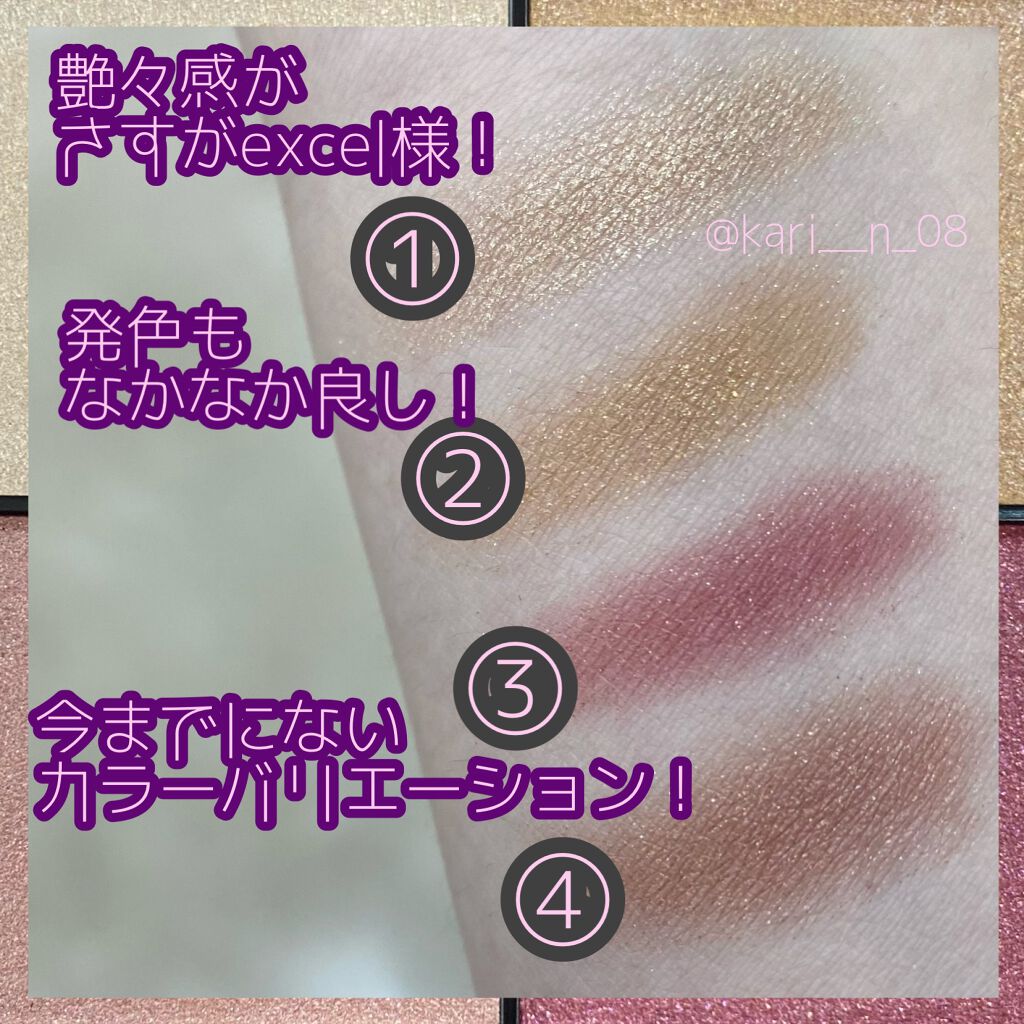 - 1.重ねてもくすまないクリアな発色。ナチュラルに溶け合う絶妙4カラー。 ツヤタイプ(左上・左下カラー):アイホール全体にぼかしたり、目尻へのポイント使いも。 ラメタイプ(右上カラー):アイホール中心や下まぶたにきらめきのアクセント。 マットタイプ(右下カラー):単色で陰影を付けたり、ツヤタイプと重ねてニュアンスをプラス。 2.うっとりするほどリッチな質感で粉飛びしないのに、軽いタッチで伸びて重ねやすいテクスチャー。 3.スクワラン(保湿)配合で目元の乾燥を防ぎます。 [PERFORMANCE] 色と質感の重ね着を楽しむ、ファッション感覚アイシャドウパレット [DESIGN] ・まぶたにひっかからない、なめらかな上質チップ ・薄型コンパクトだからポーチの中でかさばらない [QUALITY] 1.重ねてもくすまないクリアな発色 ナチュラルに溶け合う絶妙4カラー 2.パールの重ね技でまぶたに極上のツヤ感 微細多色 カラーパール 銀コーティング ガラスパール* excel GOLD-MIX処方(金パール配合)* (*右上のシャイニーカラーのみ) 3.うっとりするほどリッチな質感で粉飛び知らず!なのに、軽いタッチで伸びて重ねやすい 4.スクワラン(保湿)配合で目元の乾燥を防ぐ