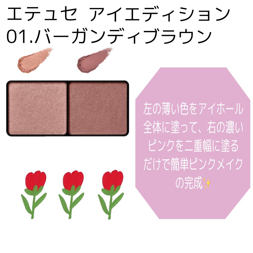 ♡エテュセ♡アイエディション01.バーガンディブラウン簡単可愛いピンクメイク💗🎀💒発色も良くてこれ1つで旬顔メイク完成!!私的に、ここ最近おすすめアイシャドウNO.1🥇カラーアイシャドウにチャレンジした事ない方でも使いやすいと思...