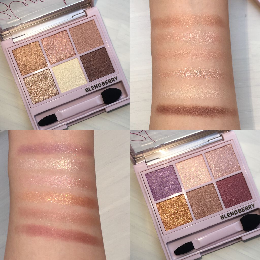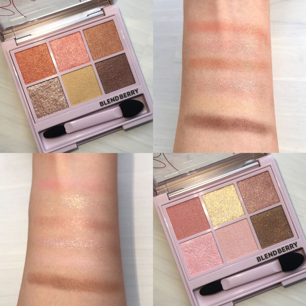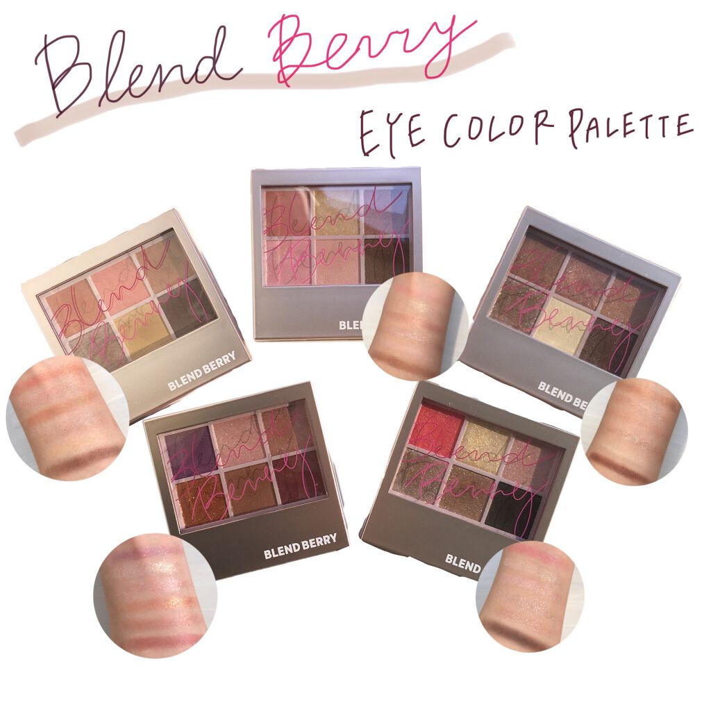 左下のベリーのようなピンクを二重幅まで。その上の、左上のコーラルをまぶたに。 真ん中の上段ラメをまぶたに足し右下のカーキを目尻に使用しました。 涙袋には、真ん中の下段を使用して 涙袋影には、右上のグレーを使用して全色しっかり使いました♫ BLEND BERRYはやっぱり可愛い❤️