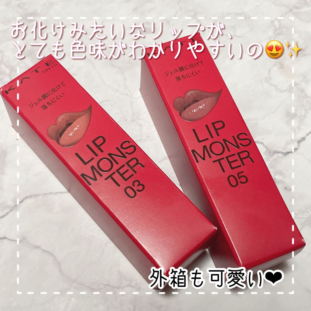 ☆.。.:*・KATE☆.。.:*・💄リップモンスター💄バズってたので購入してみました♥️😍私が選んだカラーはこの2色🙌✨03陽炎05ダークフィグ【03陽炎】シアーな発色で、とっても可愛いコーラル✨公式ではロゼベージュ💕かなり可愛い❗透け感の...