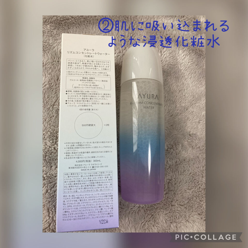 株式会社アインファーマシーズ様から商品を提供いただいたので紹介します。AYURAリズムコンセントレートウォーター<化粧水>パシャッとうるおう、肌に吸い込まれるような肌なじみがいい化粧水です。シャバシャバ系のテクスチャーの化粧水です。化粧水をコ...