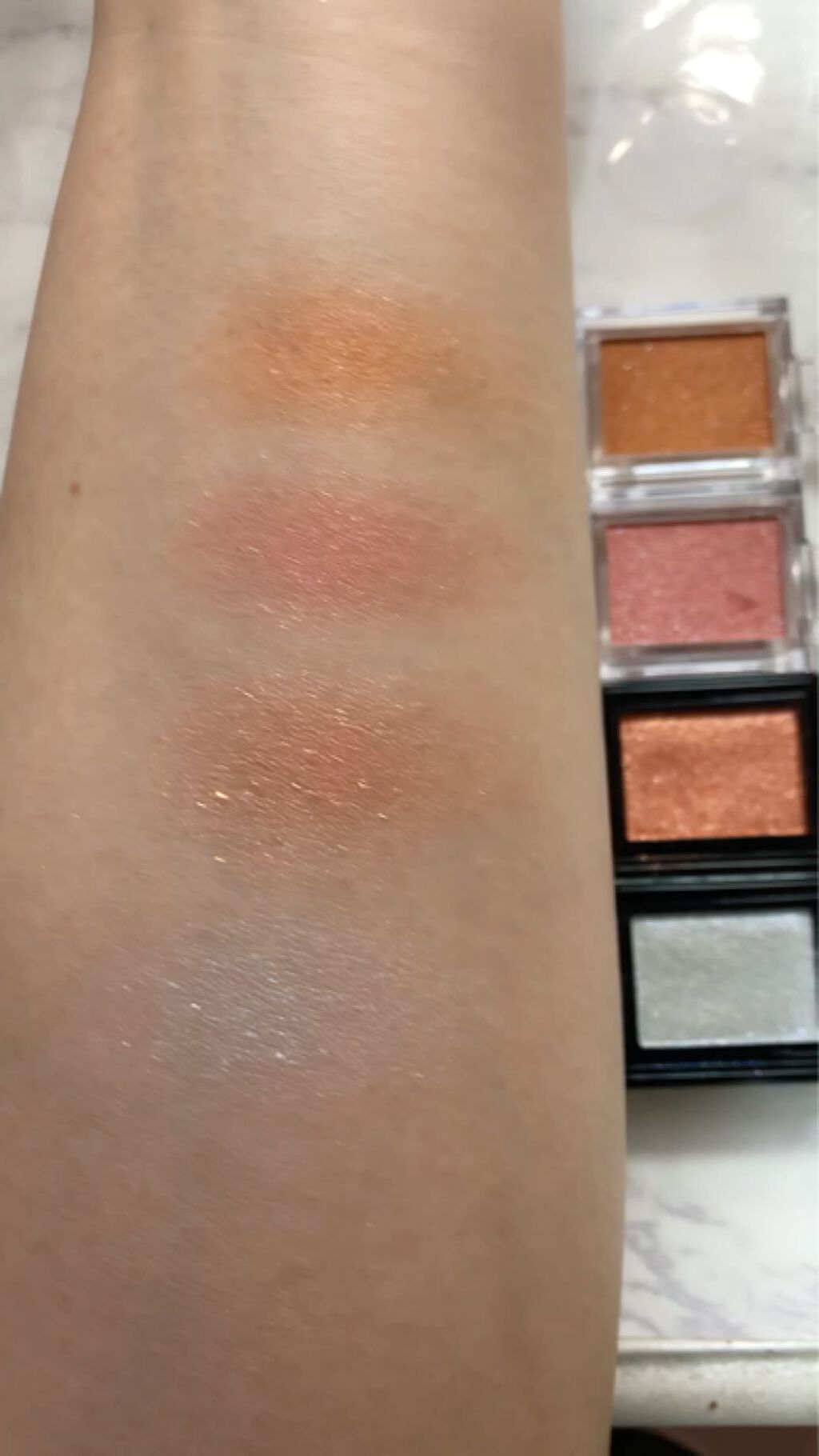 指で押さえてむにゅっと パールでキラキラ感はあるけど、細かいので本当に上品♡ 肌に乗せると見た目よりも明るいテラコッタオレンジに発色しました。 さらさらなのに伸びもよく、濃さも自由自在で、とても使いやすい&かわいい新作チークでした♡♡♡