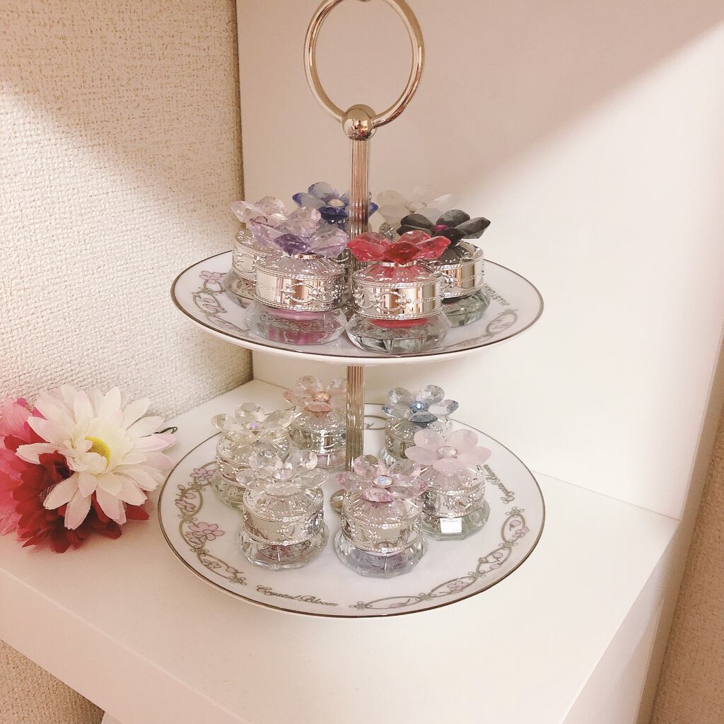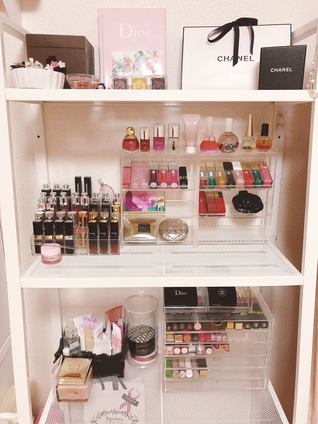 眺めて楽しめるコスメ収納にしています。部屋が狭いので、ドレッサーは置かず、鏡つき本棚を使っています。 アクリルで丈夫なので、かなりの重さを入れても壊れません。高さが丁度よく奥行きがあるので収納力抜群です。 回転するコスメタワーです。プラスチックで、5年くらい使っていて、傷は付きますが壊れず丈夫です。